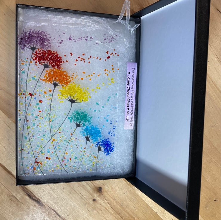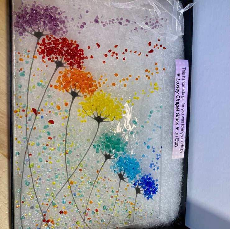 Every picture is individually made so no two are ever exactly the same, the glass picture comes complete with a ribbon attached for hanging.