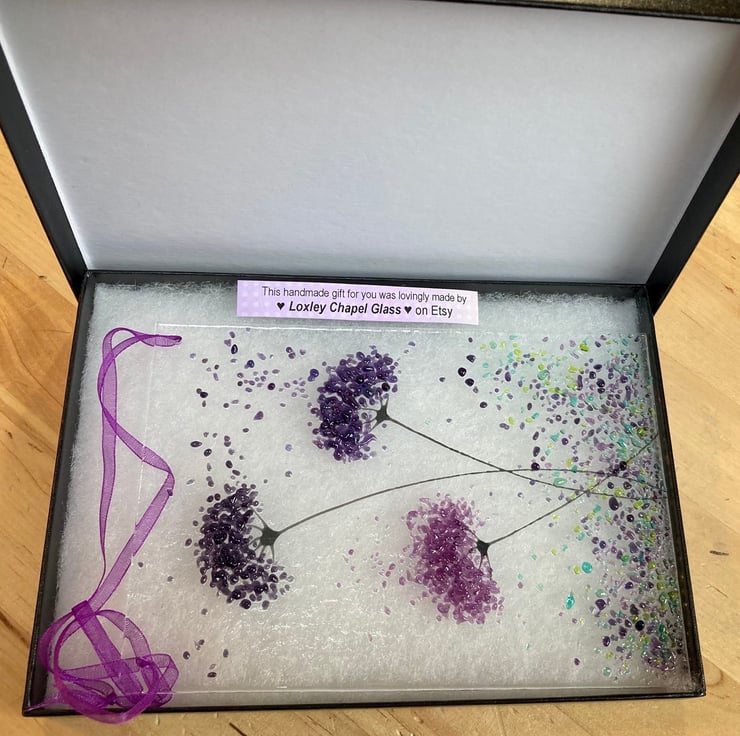 Every picture is individually made so no two are ever exactly the same, the glass picture comes complete with a wooden display stand.