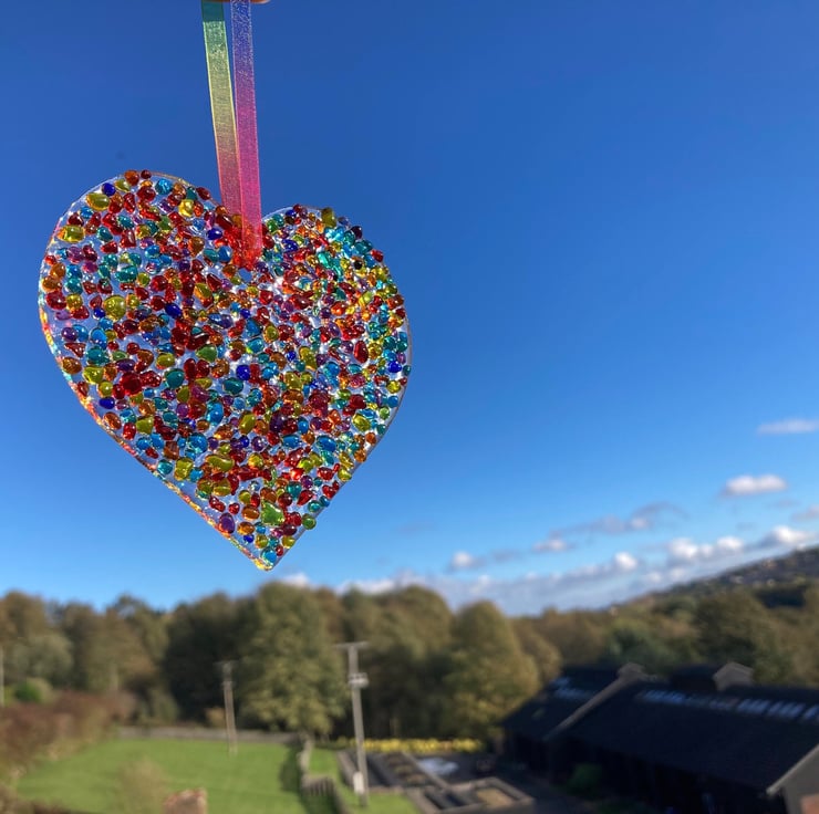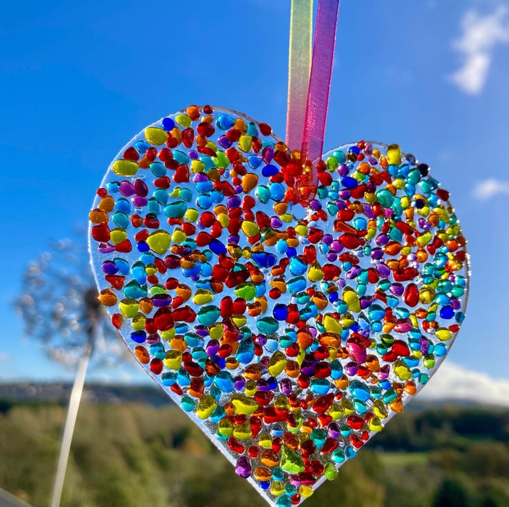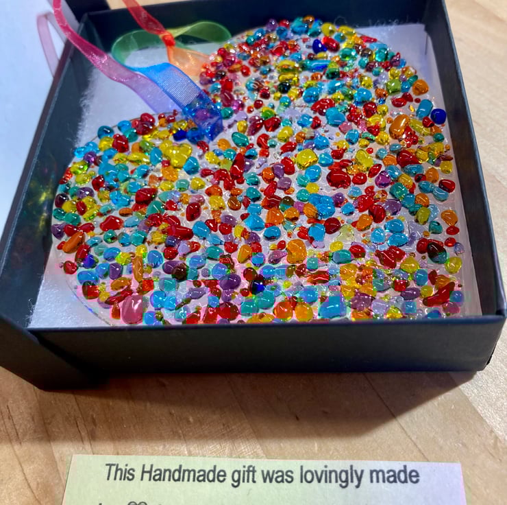 The glass heart size is approximately 9.5 x 9.5 cm.