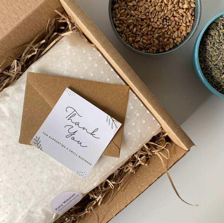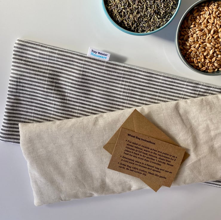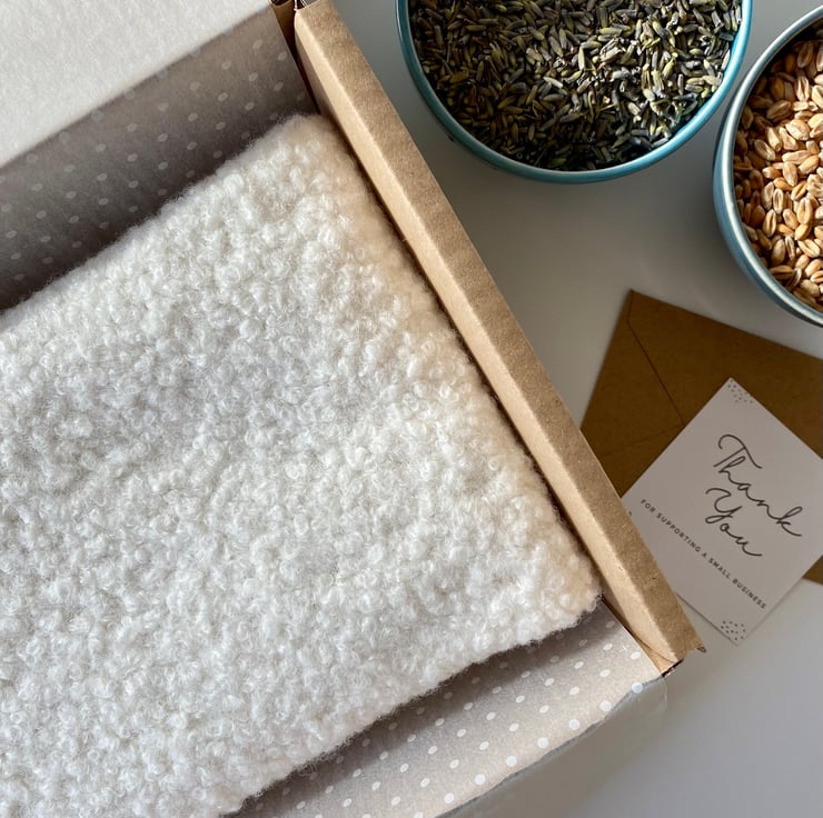 Treat yourself or gift a loved one to this beautiful handmade wheat bag that can be filled with a blend of organic lavender and wheat or wheat only. It features a washable cover made from your choice of white star, grey stripe, grey mulberry or boucle fabric and comes ready gift wrapped in a pretty polka dot tissue paper as standard in a cardboard flip box making it a perfect self care gift for a mum or friend. Instructions for use are included in a cute mini Kraft card envelope.