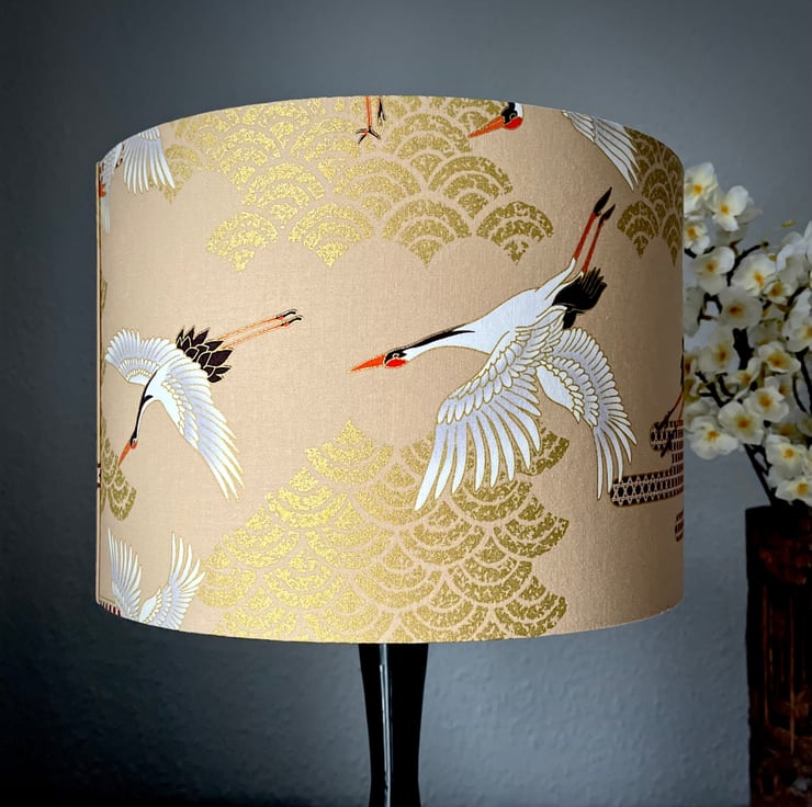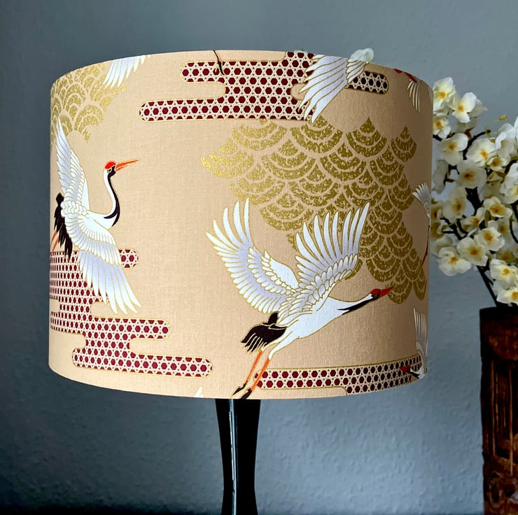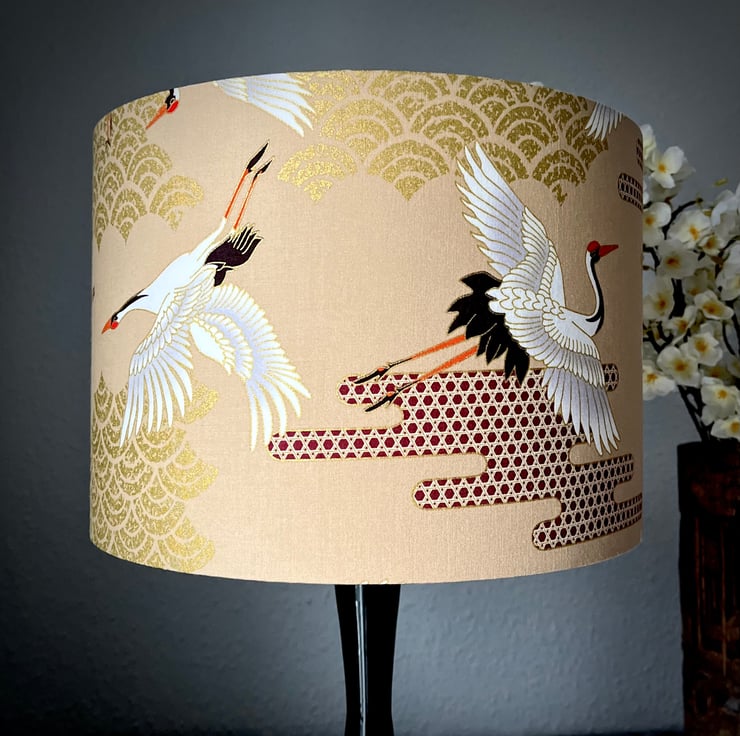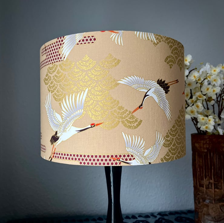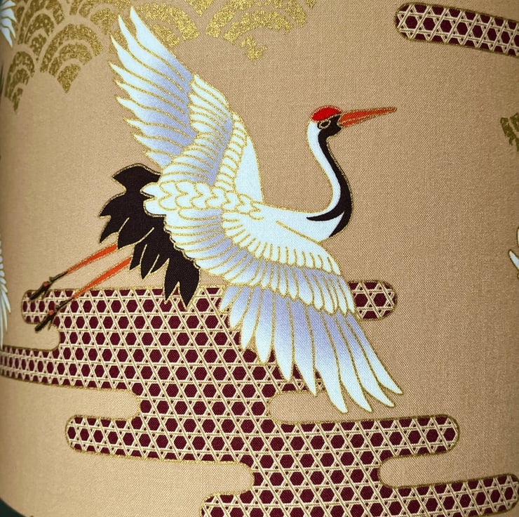 A stunning shade showing flying cranes with burgundy and metallic gold details on a beige background. The beautiful red-crowned cranes in this design are printed both ways up so it works as a lampshade or ceiling pendant.