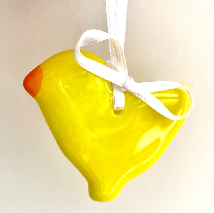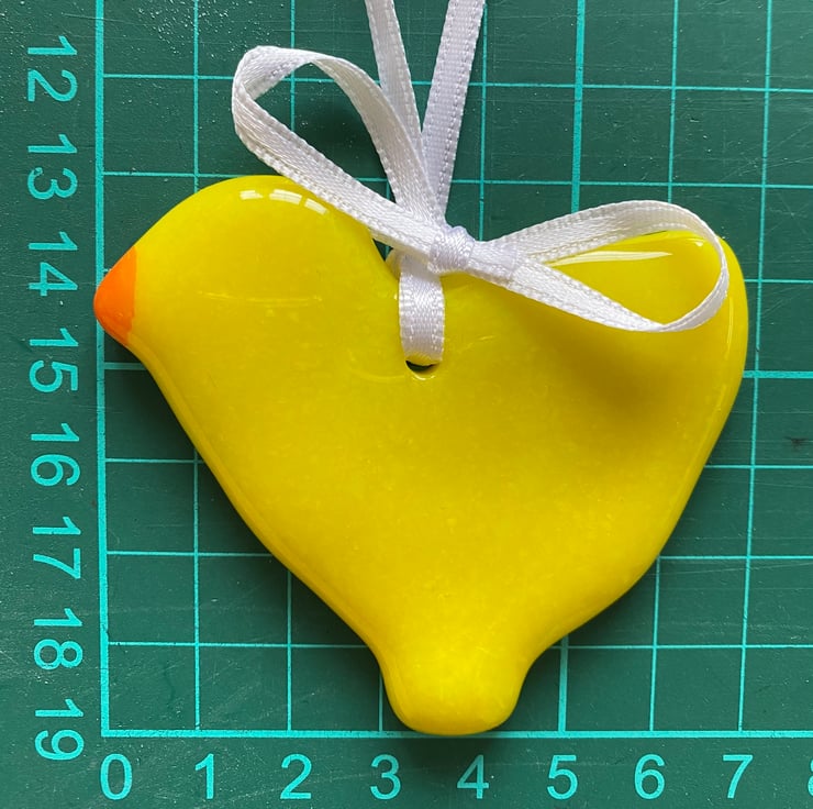 This simple but cute Easter chick decoration was created by fusing hand crushed glass in a stainless steel cookie cutter mould. It was fused at 800 degrees Celsius in a specialist glass kiln. Once cooled it was drilled with a hole to allow it to be hung on a white satin ribbon.