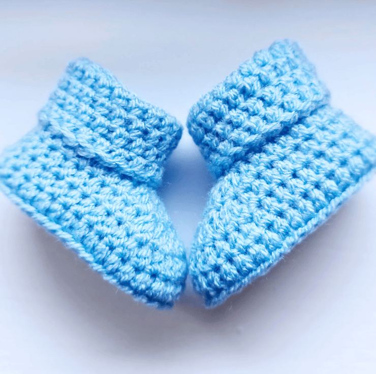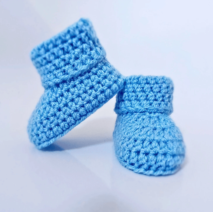 Crochet Baby Booties pictured in Cloud Blue – Newborn to 6 Months