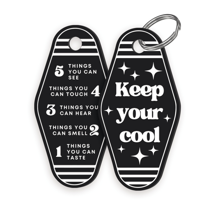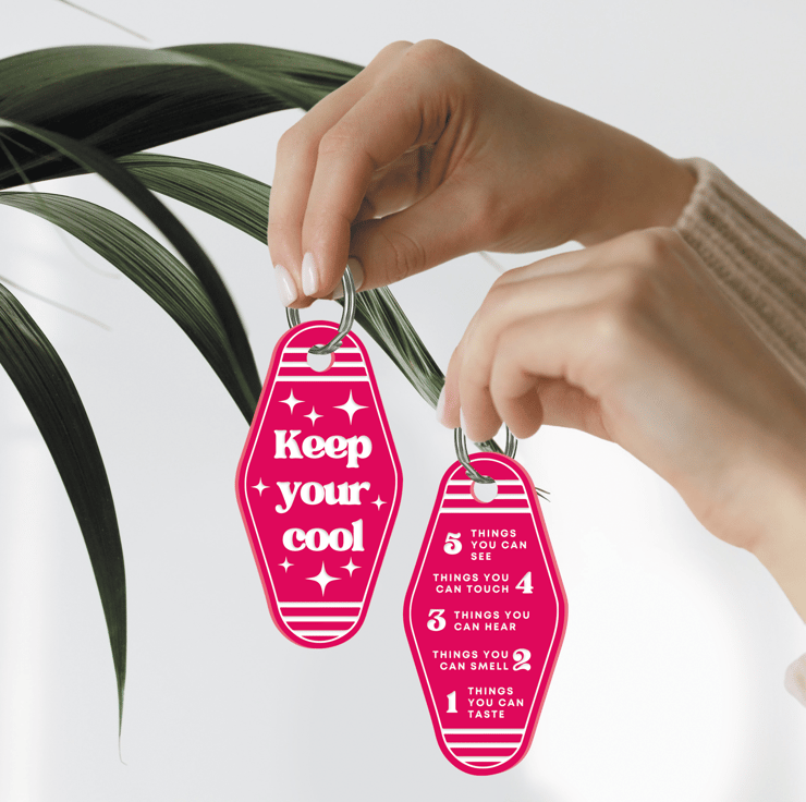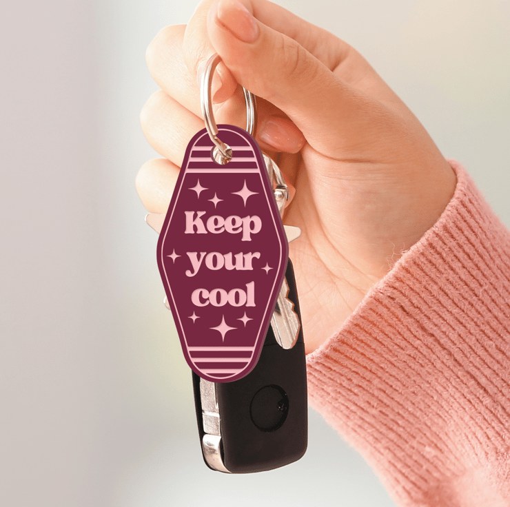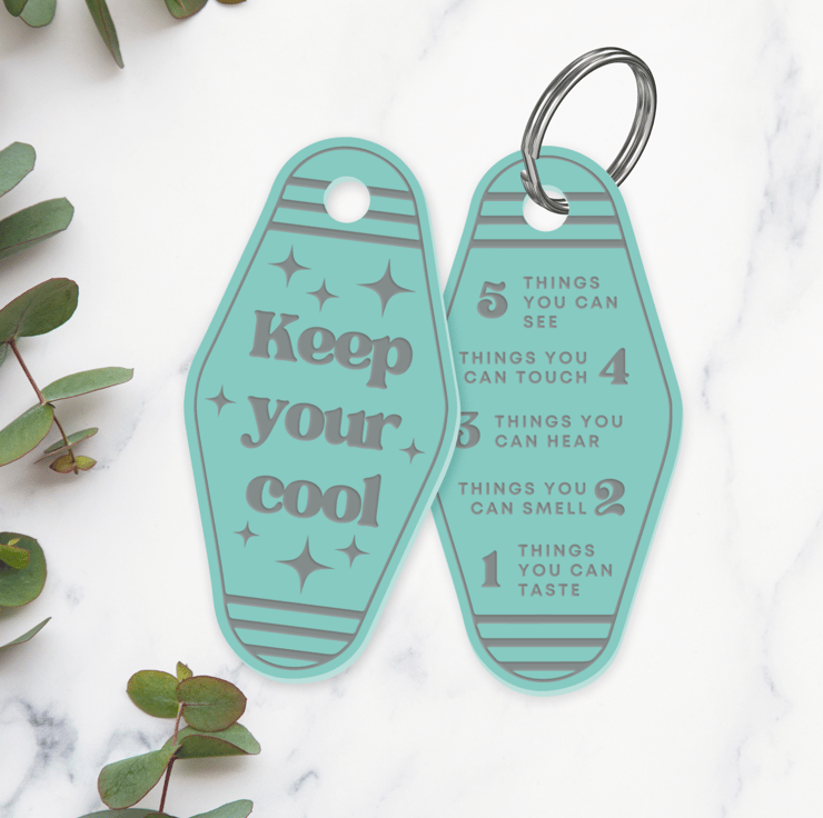 Embrace a sense of calm wherever you go with our "Keep your cool" motel-style keyring. This engraved keyring not only adds a touch of retro charm to your keys but also serves as a helpful anxiety relief tool. On the front, the words "Keep your cool" remind you to find peace in the moment.