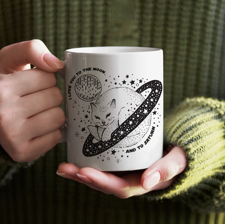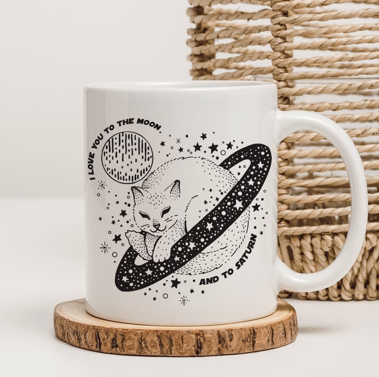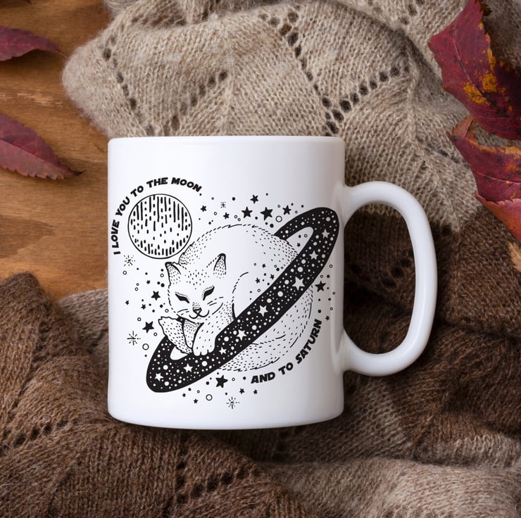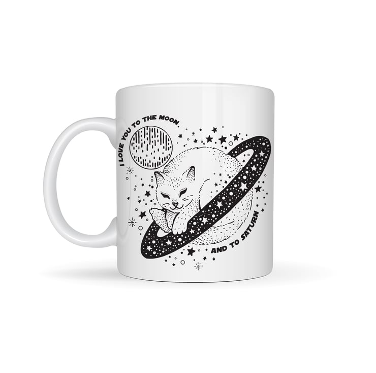 Indulge in celestial romance with our enchanting "I Love You to the Moon and Saturn" mug! Crafted with love and adorned with whimsical illustrations, this mug is sure to brighten anyone's day.