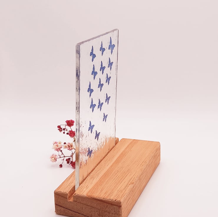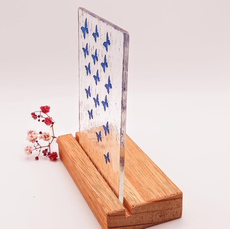 The 3mm clear glass is first given a gentle firing in the kiln to smooth out the sides. Then the butterfly stencil designed by myself is hand sandblasted on with the blue finish finally added. The stand is solid wood (type will depend on sources available at the time), handmade with a groove cut out for the glass to sit in. Please note that the glass is not fixed in the stand so it will be loose to enable it to be dismantled.