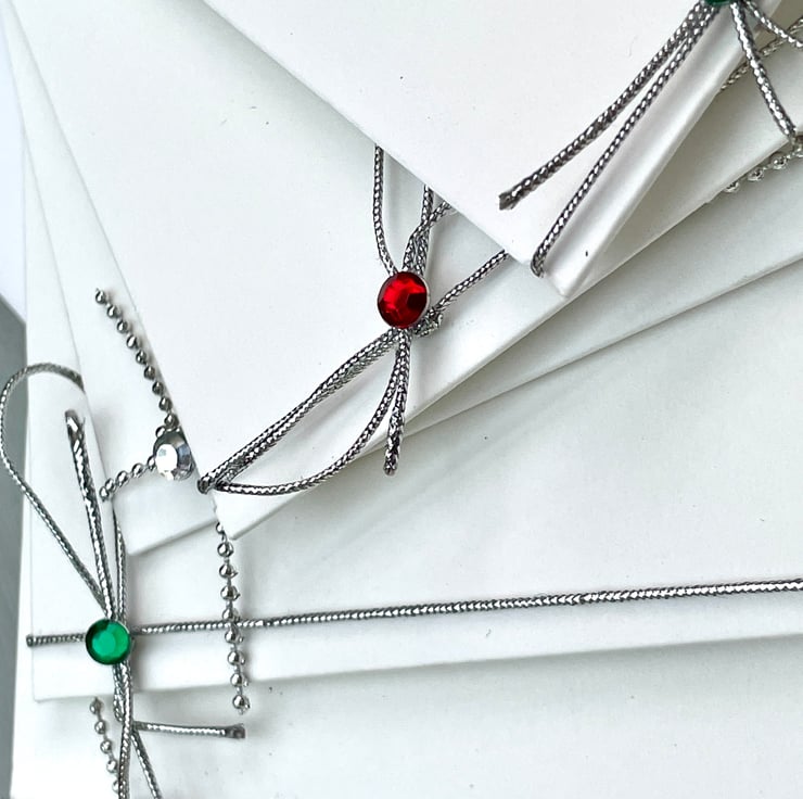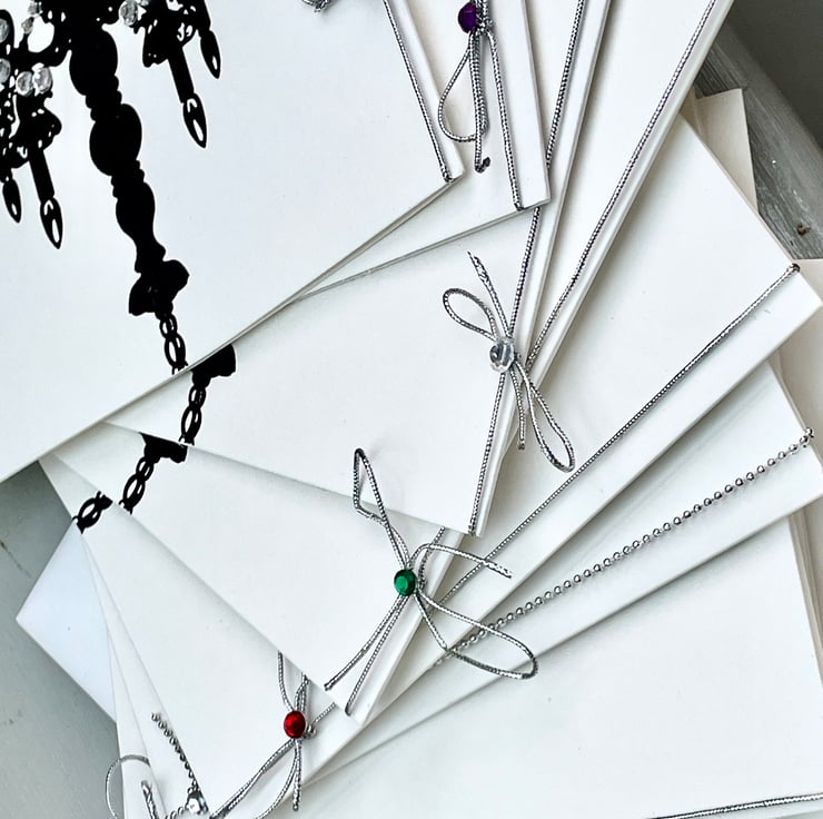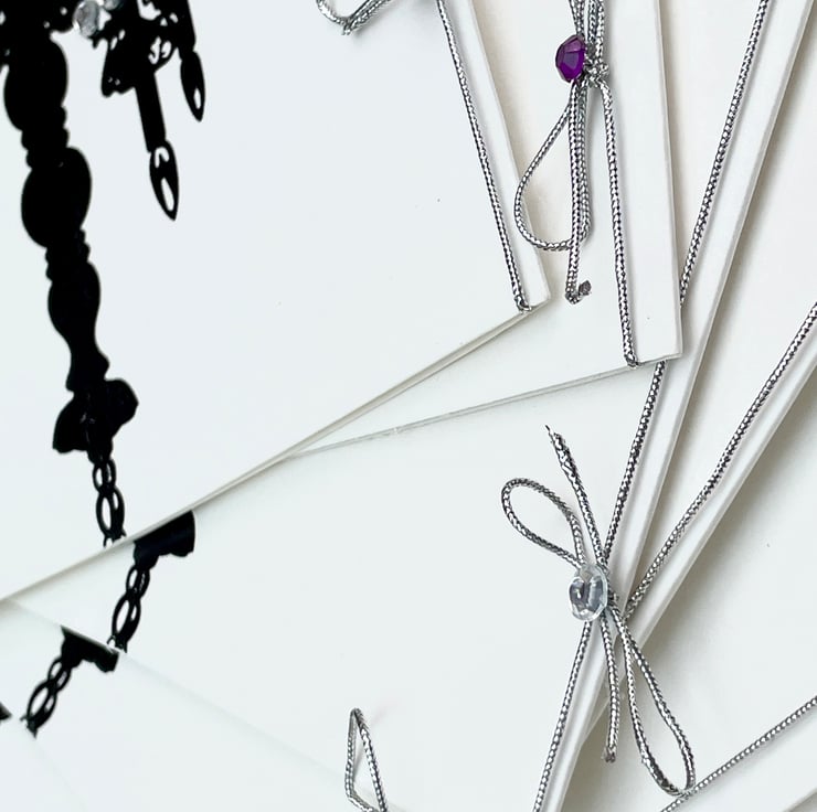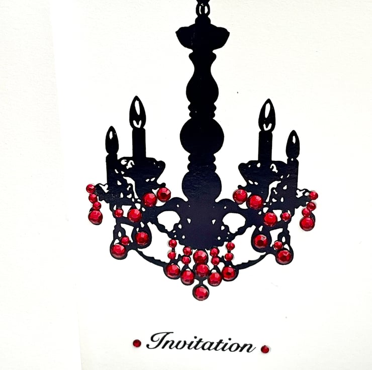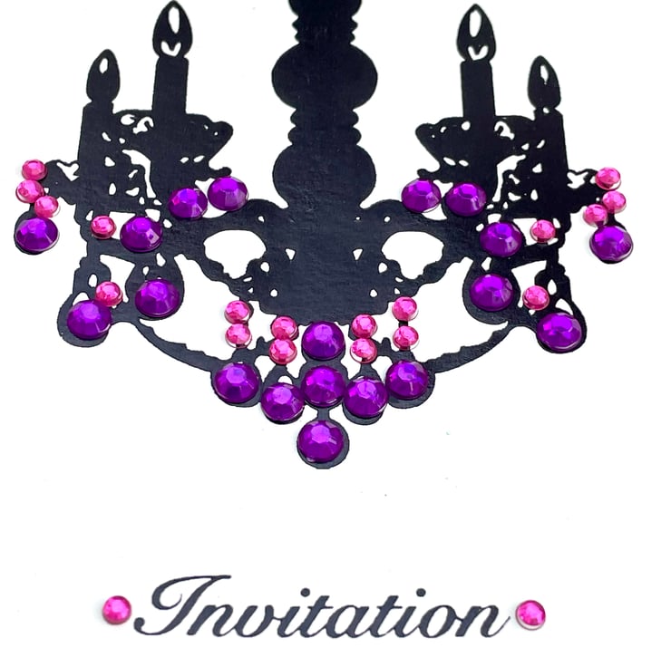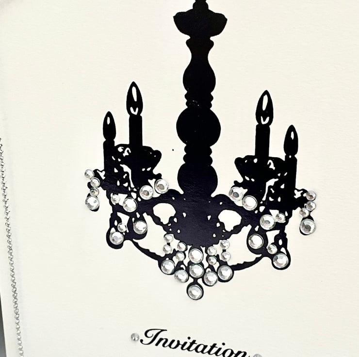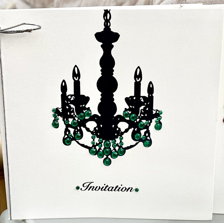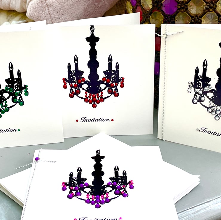 A lovely and versatile set of invitations. These 14.5x14.5cm invitations are elegant and useful. They are a plain white background with a silhouette of a chandelier printed in black. These have been individually embellished with faux gems in several colours. They are silver (3), green (2), red (2) and pink and purple (2). Each has a silver cord or chain around the spine with a matching gem attached. The word Invitation is under the chandelier and is embellished with more matching gems. The inside is blank for your own words or printing. They can be used for weddings, parties, hen do's, engagements and so on. Only a small number but wonderful for a small and intimate do.