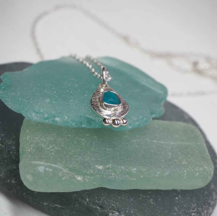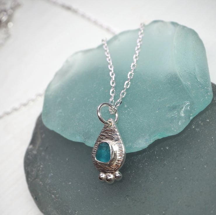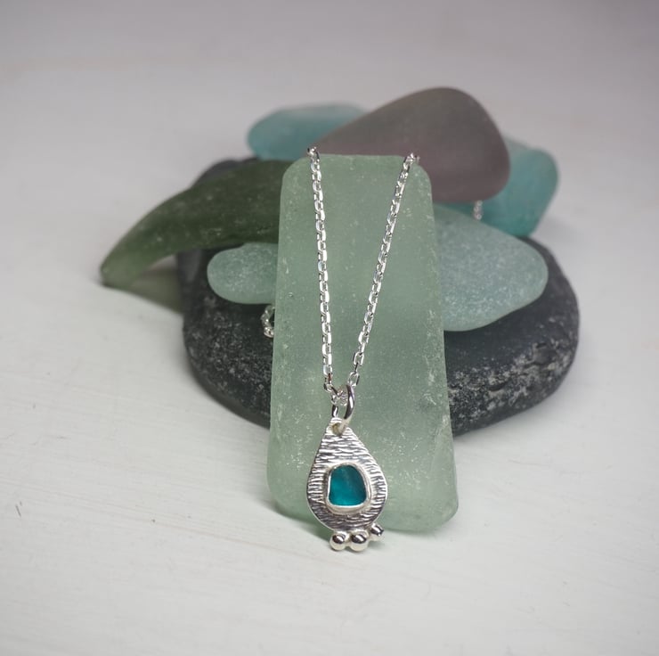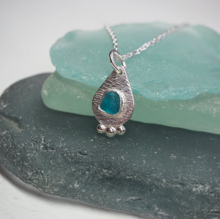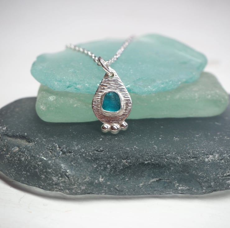 Dainty piece of turquoise sea glass set on a droplet shaped silver pendant with 3 small recycled silver balls fused to the bottom.