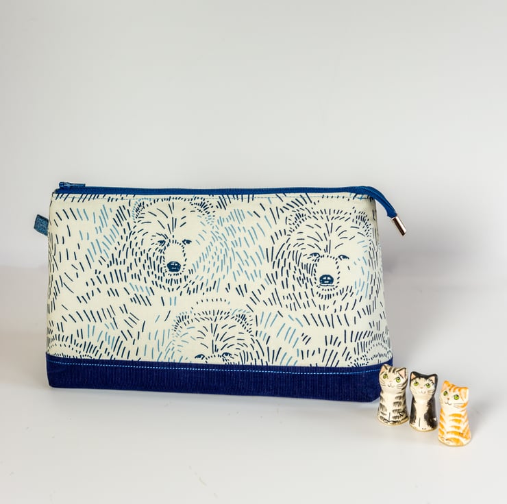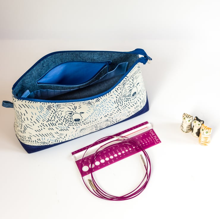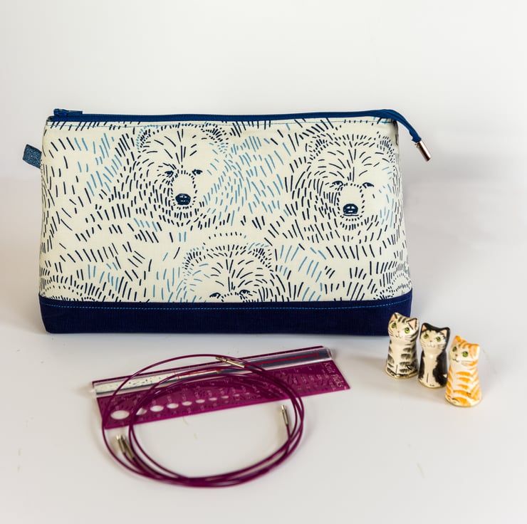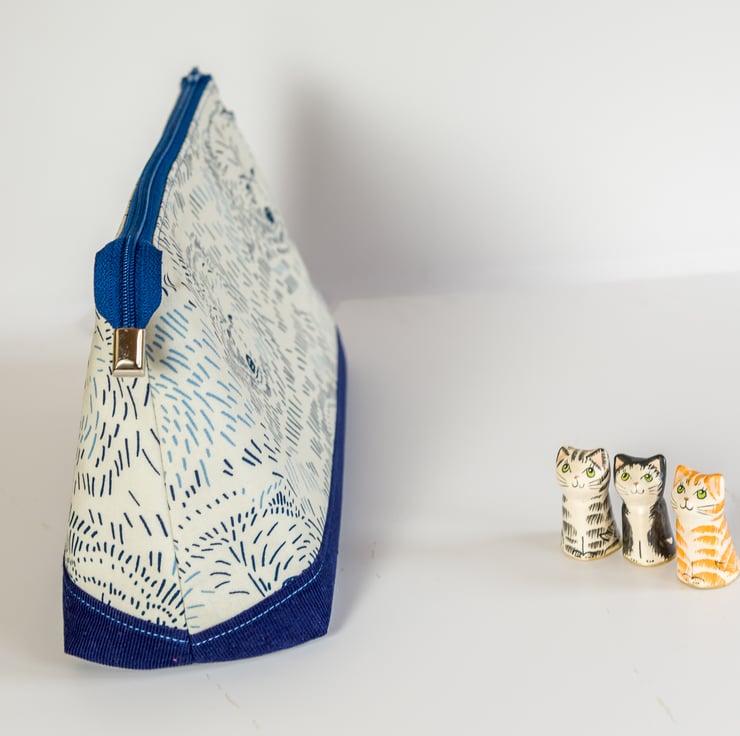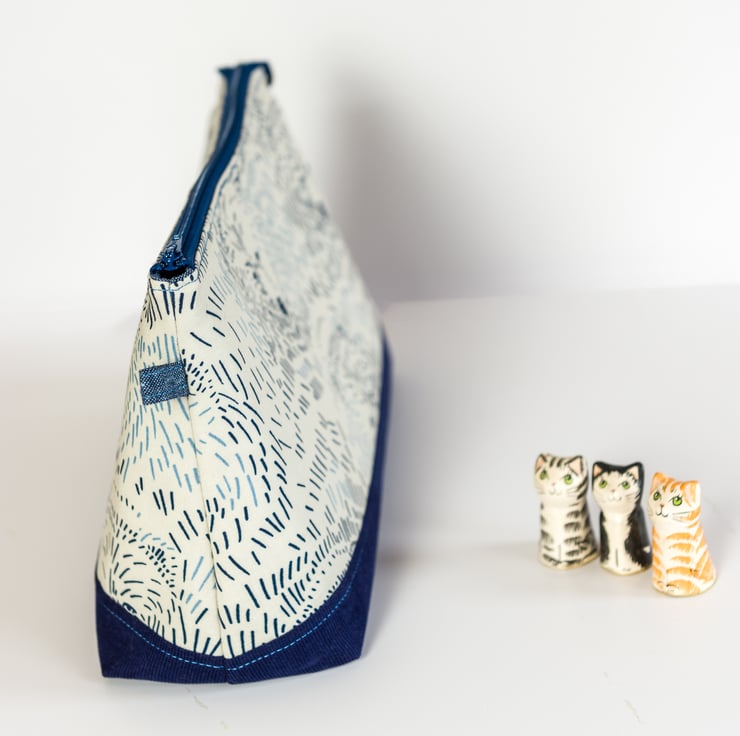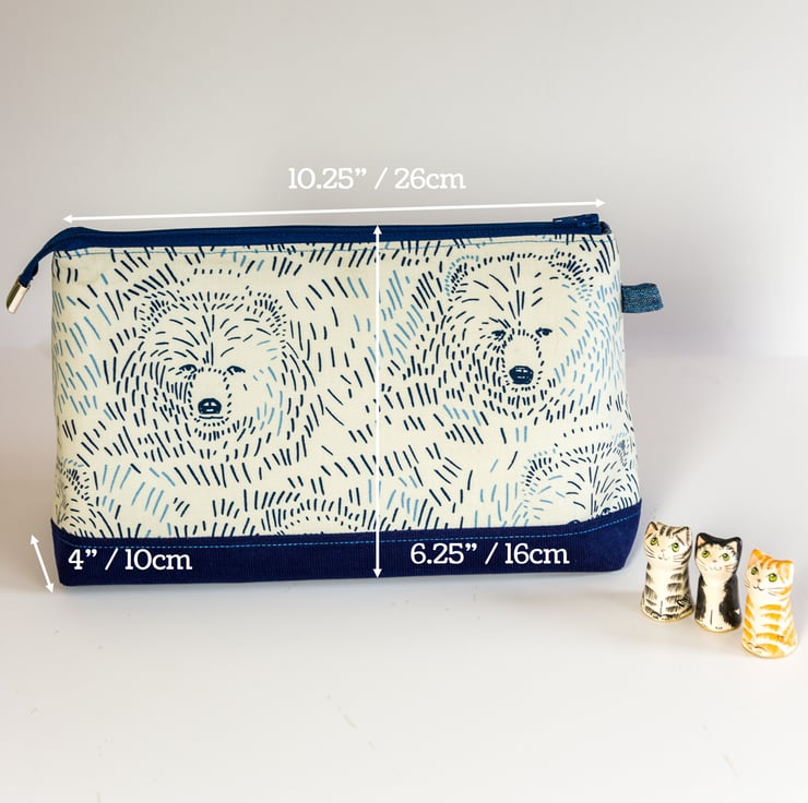 You can see the dimensions of the bag in last photo and I've included some accessory props in the photos to give you an idea of what it will hold - there's plenty of room. I've added the main zip on top in a way that means that the bag opens right up to allow you easy access to the contents - do be aware though that this creates small gaps at each side of the zip, as you can see in the photos. Finally, I've added a fabric loop to the outer in case you want to add a wristlet strap, and there's another one inside the bag, which you may find useful to clip things to that you don't want to slosh