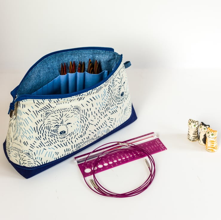 The bag has 2 sets of slip pockets for needle tips - one on each side. One of them is 2.5" / 6.25cm tall and the other is 3.5" / 9cm, which is perfect for both short and longer tips. Each pocket has 11 slots - 6 for the slimmer tips, 5 for the fatter ones and, finally, a larger slot that you can use for your really chubby tips, or maybe for other notions or tools you like to keep together with your tips. On the side with the shorter pocket, there's also a generously sized zip pocket, perfect for keys, connectors and end caps to be tucked away safely. Please note that the height of the bag allows for storage of standard length tips of 5". If your tips are longer, please send me a custom request and I'll make a taller bag for you. Similarly, if you have different size tips and would like custom pockets for your collection, just let me know.
