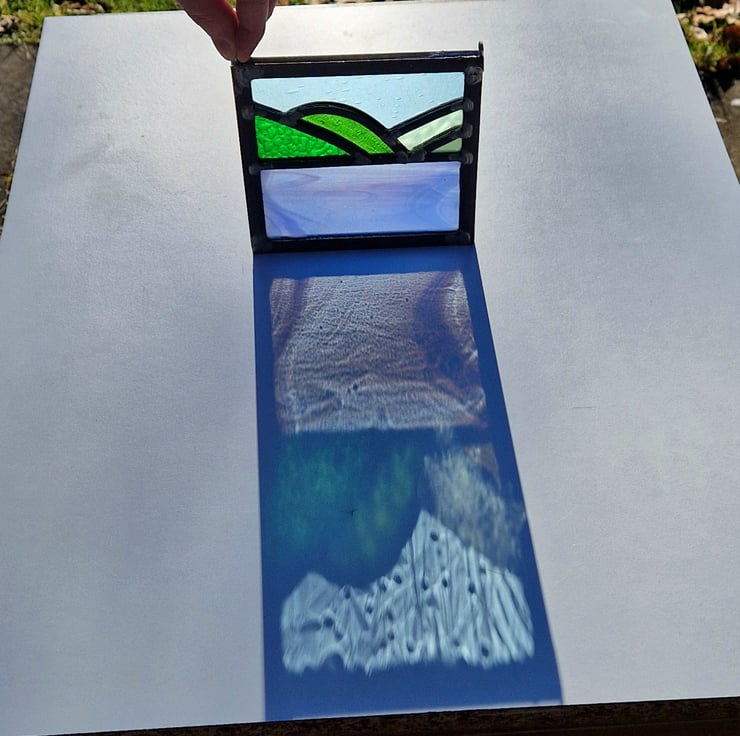 Once cut, the panel is then leaded, soldered and cemented. Hooks have been added for hanging this piece in your window.