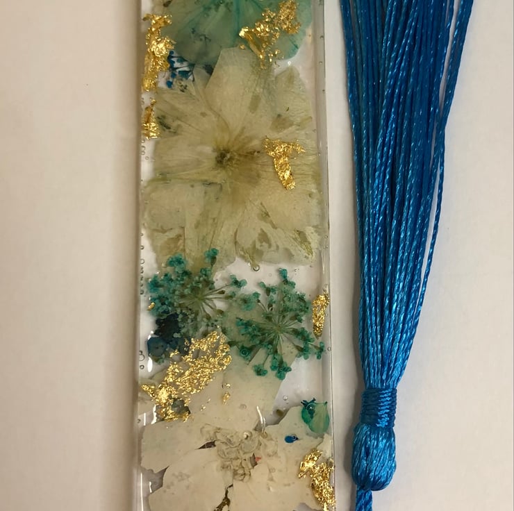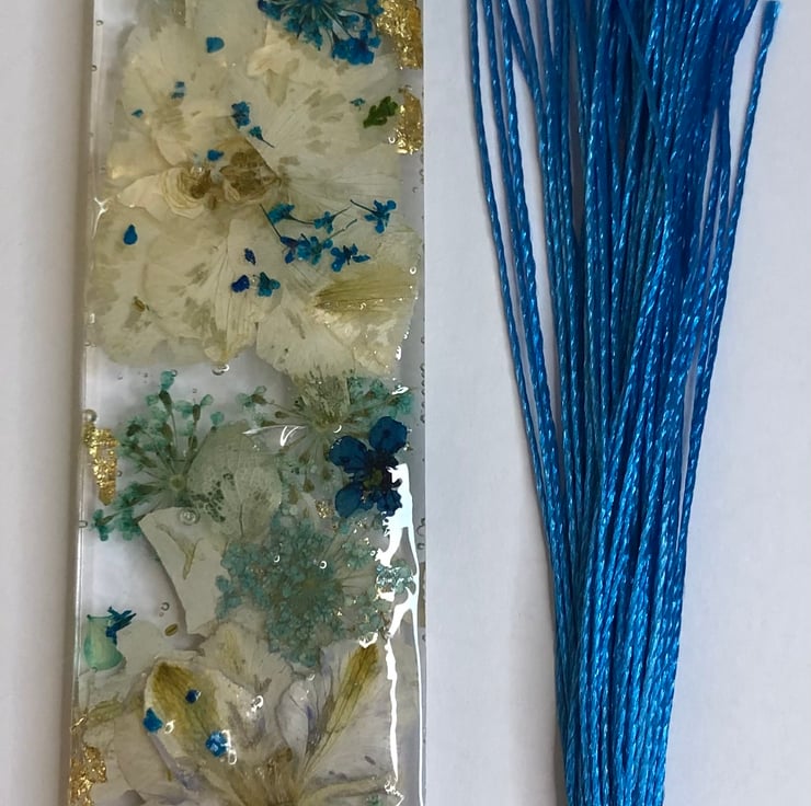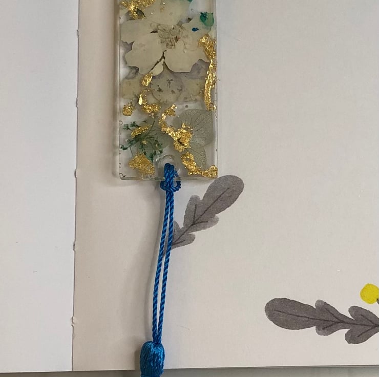 I made this bookmark using epoxy resin. The bookmark contains an assortment of real dried blue and white flowers and gold leaf foil, which can be viewed on both sides of the bookmark. The bookmark is finished with a royal blue bookmark tassel. The bookmark is 14cm in length and 2.5cm in width (the bookmark is 25cm long, including the length of the tassel). Each bookmark I make is unique and no two are the same. The first photo shows the front of the bookmark and the second photo shows the back. Pricing includes UK postage.