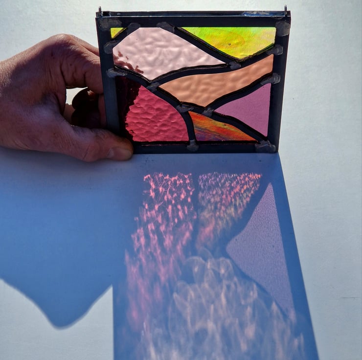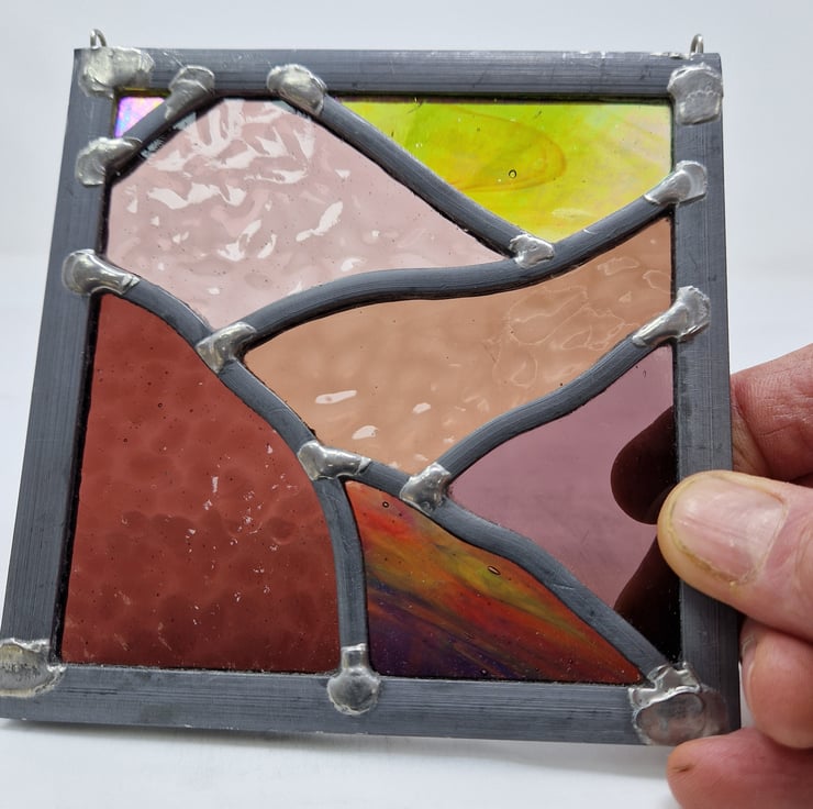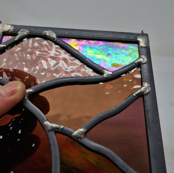 Once cut, the panel is then leaded, soldered and cemented. Hooks have been added for hanging this piece in your window.