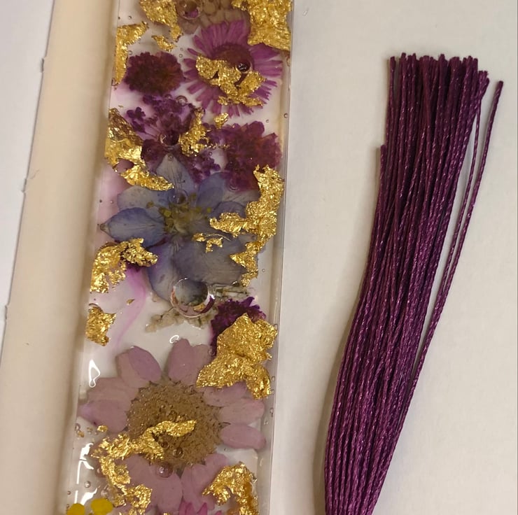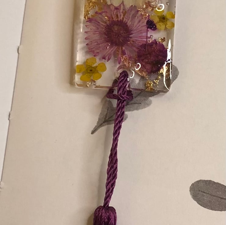 I made this bookmark using epoxy resin. The bookmark contains an assortment of real dried pink, purple and yellow flowers and gold leaf foil, which can be viewed on both sides of the bookmark. The bookmark is finished with a dark purple bookmark tassel. The bookmark is 14cm in length and 2.5cm in width (the bookmark is 25cm long, including the length of the tassel). Each bookmark I make is unique and no two are the same. The first photo shows the front of the bookmark and the second photo shows the back. Pricing includes UK postage.