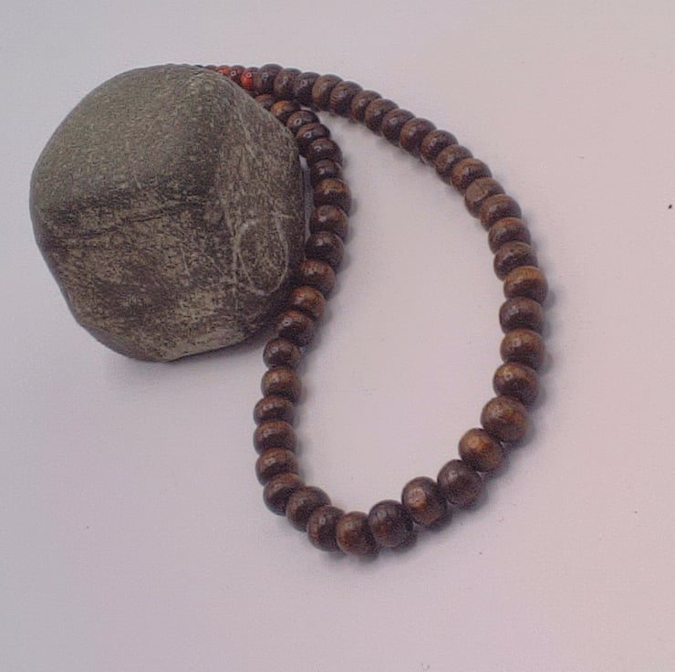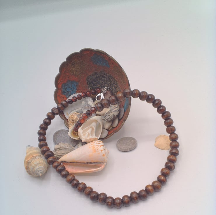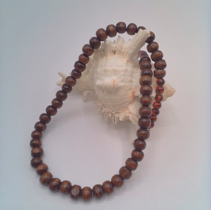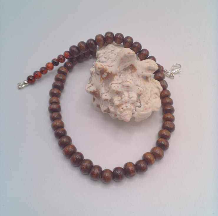 This fun beaded necklace is an ideal birthday gift, Christmas gift or gift for Fathers Day for any of the men in your life. The necklace is made using 8 mm nut brown wooden beads and 6 mm round mottled orange and brown glass beads. The clasp is a silver plated lobster clasp. It is 17 inches (43 cm) long. The necklace will be dispatched wrapped in tissue paper in an organza bag and delivered to you via Royal Mail first class post.