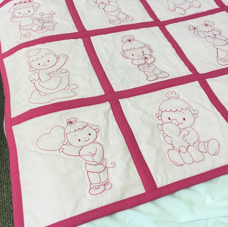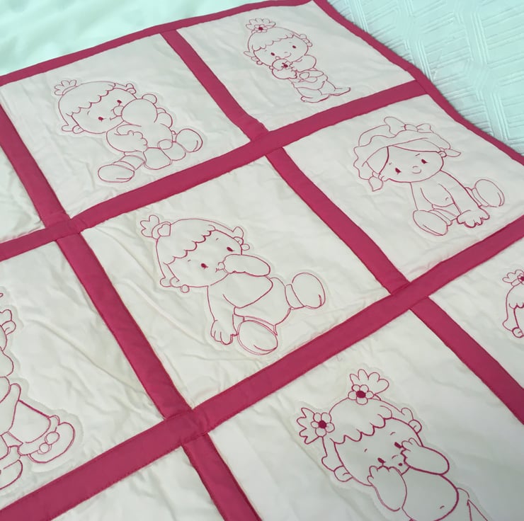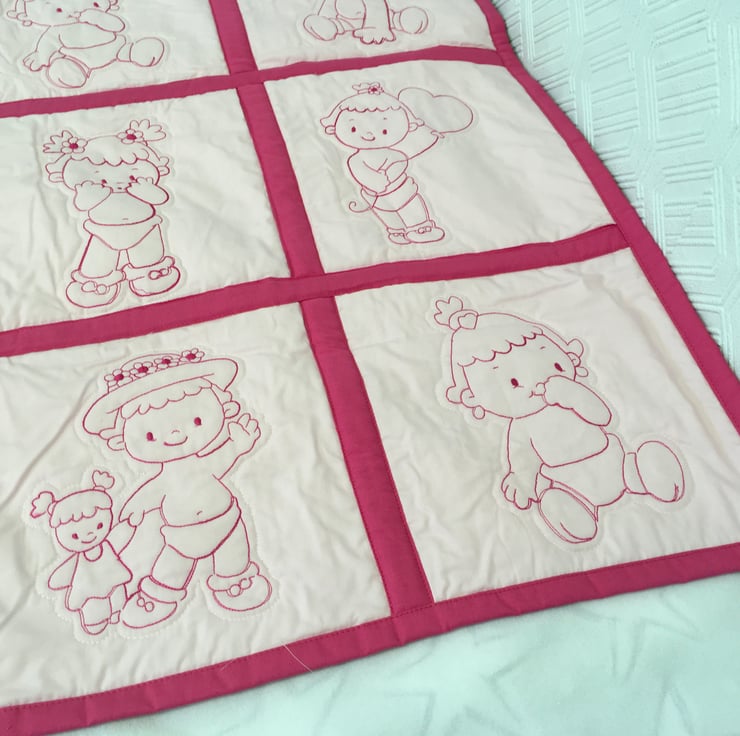This nice sized quilt with such cute embroidery designs as these, is sure to be a big hit with the lucky new owner. There is plenty to look at as the child grows and takes more notice. This baby girl is getting up to all sorts.