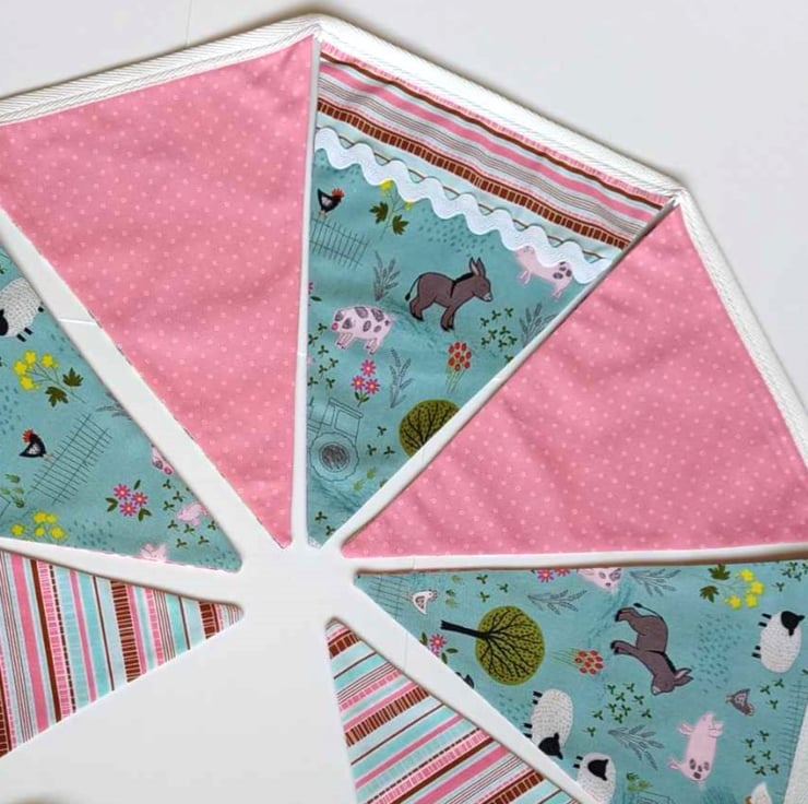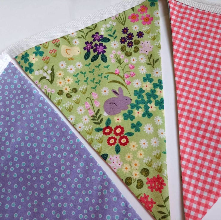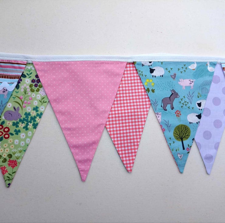 Who says bunting should just be for certain times of the year. My range of reversible bunting can be enjoyed all year round - this one combines bunnies in a floral garden with a farm animal print.