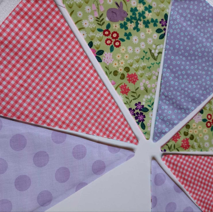 Each flag is securely sewn to white cotton herringbone tape binding with loops at each end for hanging. I always double sew my bunting for extra strength.