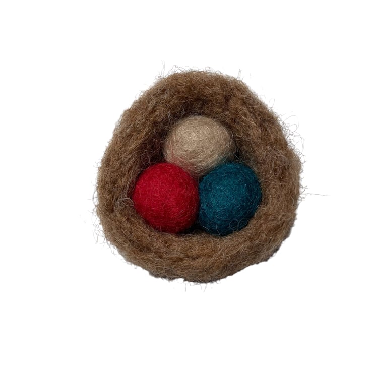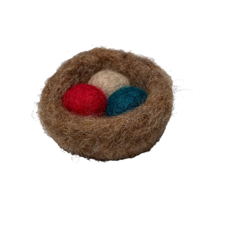 A sweet little nest has been needle felted and filled with 3 felt eggs. The nest has been made using woollen fibres and a barbed felting needle to sculpt it into shape. Ideal as decorations for easter - place on the mantlepiece, decorate the easter table or give as a gift. The nest is brown in colour and is filled with randomly coloured eggs. If you would like to hang from an easter tree a hanging thread can easily be sewn through the nest.