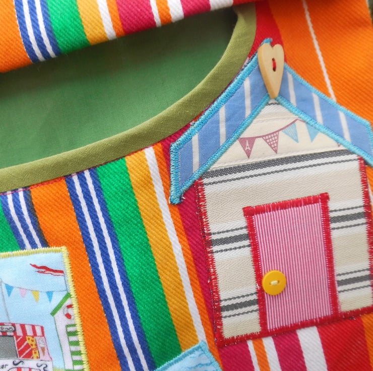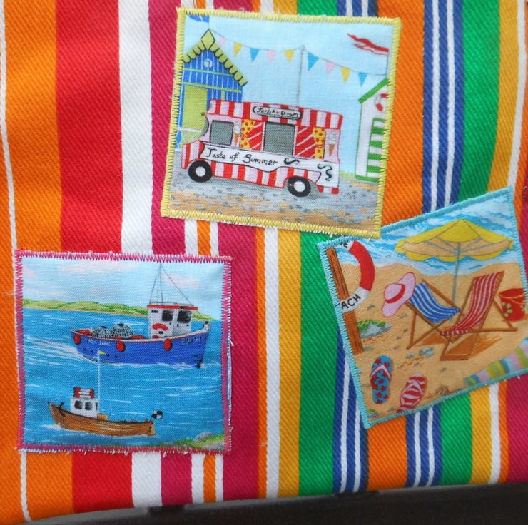 On the front I have stitched an appliqué of a beach hut, finished with cute buttons, and three fabric pictures - an ice cream van, fishing boats and deck chairs.