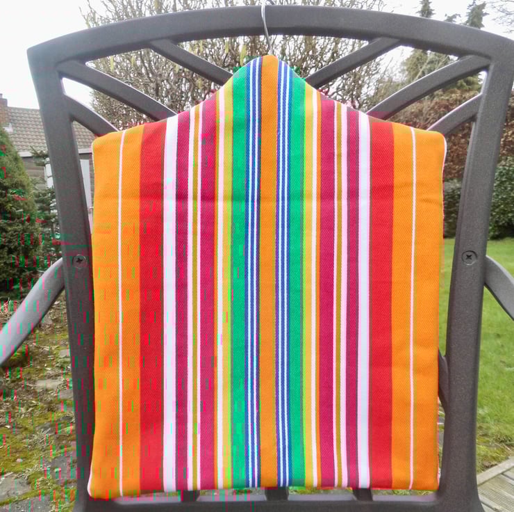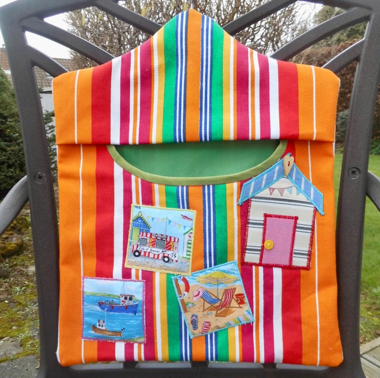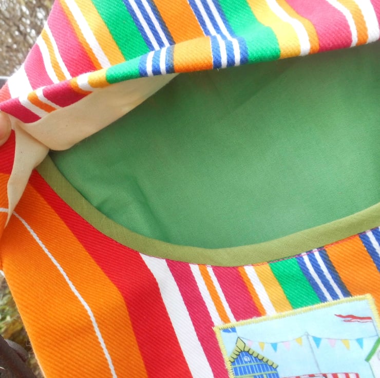 A very strong and fully lined peg bag made with a heavy weight cotton fabric in bright deck chair stripes. The back is lined with plain green cotton fabric which you can see through the opening, while the front is lined with natural calico.