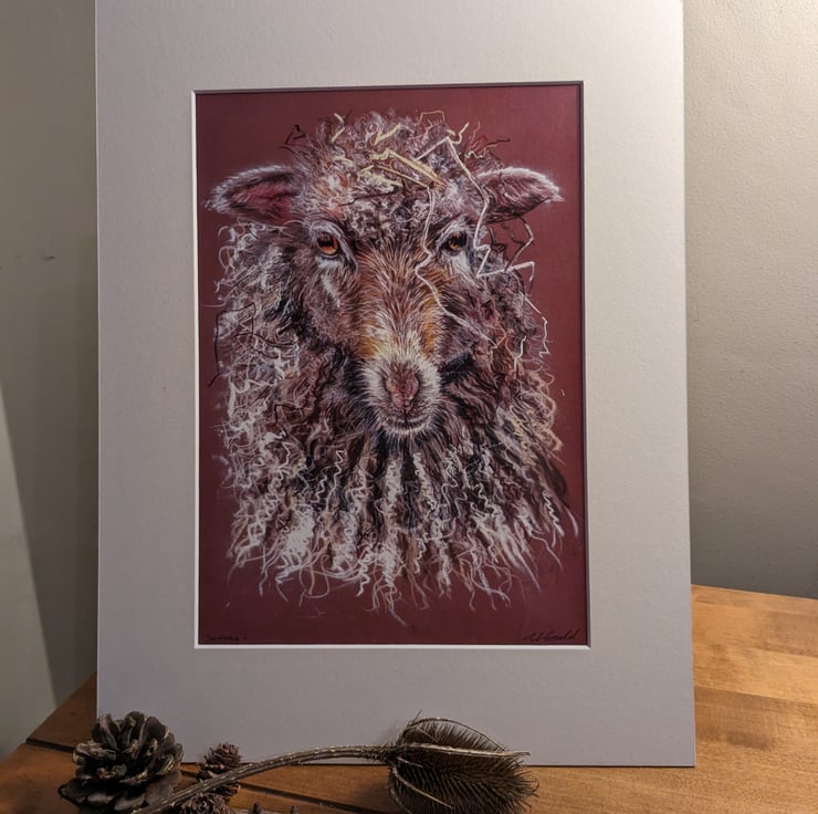 An open edition signed high quality print of an original drawing of a sheep. The original art work is mixed media. I used artists quality coloured pencils and pastels. Each print is professionally mounted in a cream mount. It will be wrapped in cellophane and tissue and posted in a sturdy box.