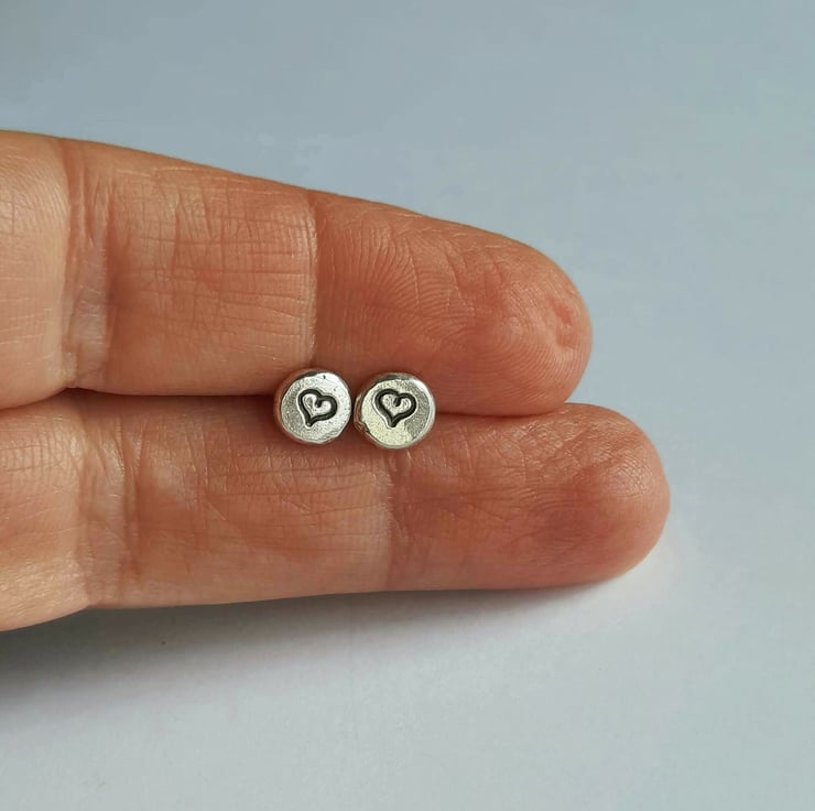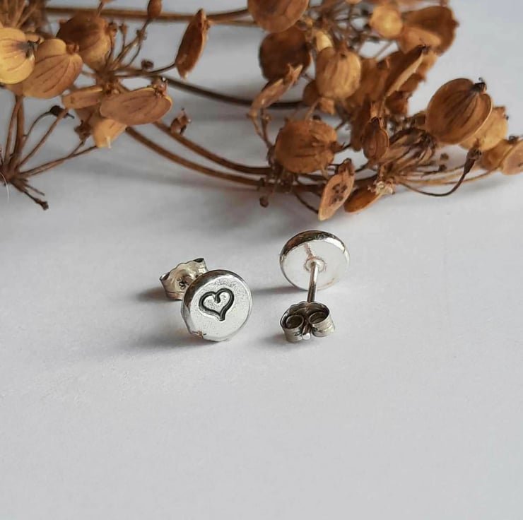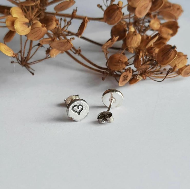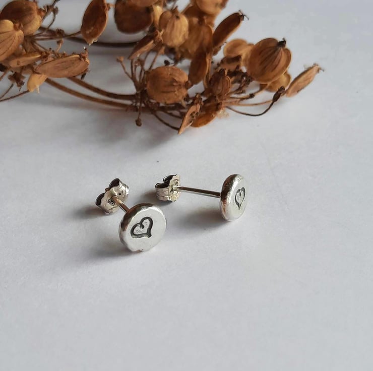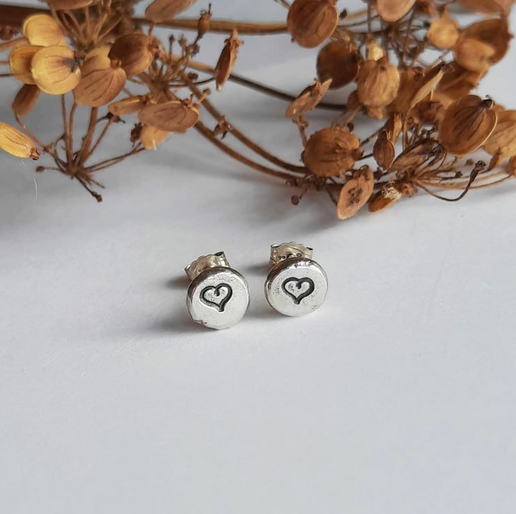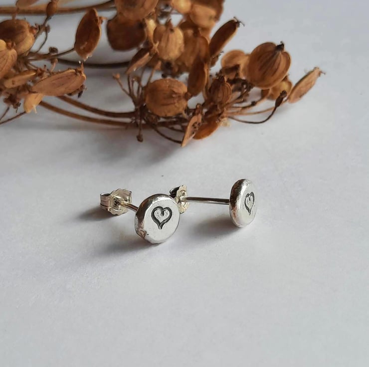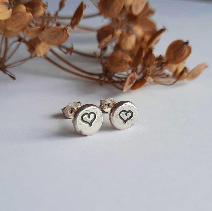 They're also eco friendly as they're created by melting down all the waste and offcuts of sterling silver that gradually accumulate in my studio. The scrap silver is melted with a butane hand torch to create tiny pebbles, which are then flattened with a hammer and then hand stamped with the little love heart design.