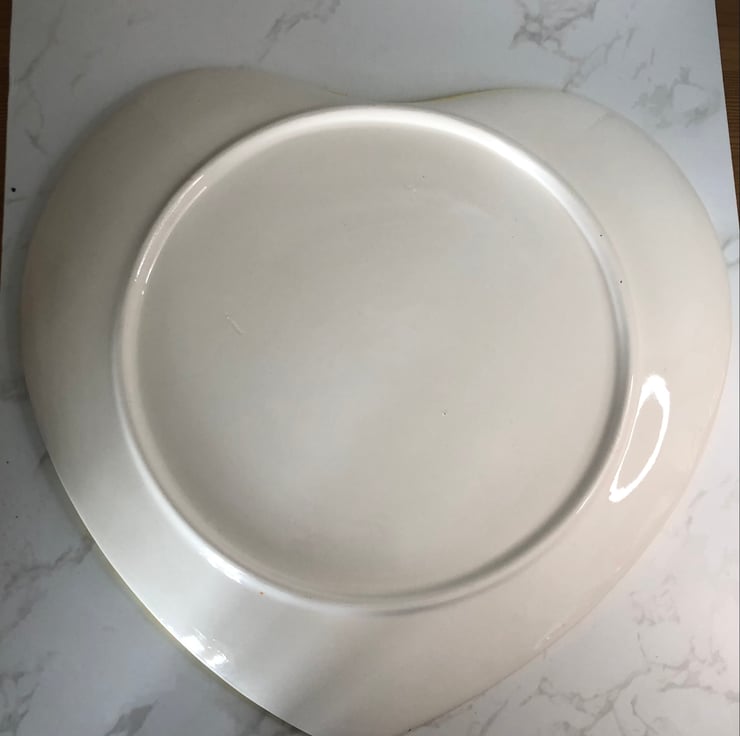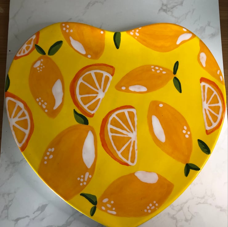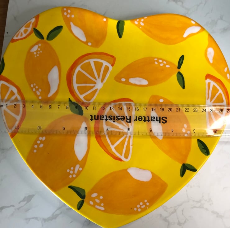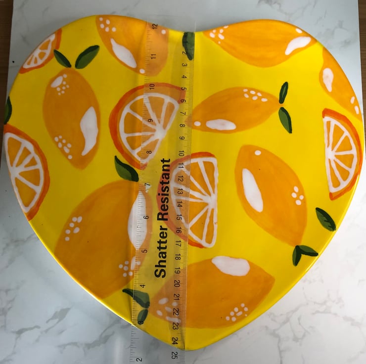 I hand painted and glazed this large heart shaped plate which measures 27cm in width and 25cm in length. The background is painted a golden yellow, with whole orange/yellow lemons and lemon slices and green leaves. Pricing includes UK postage.