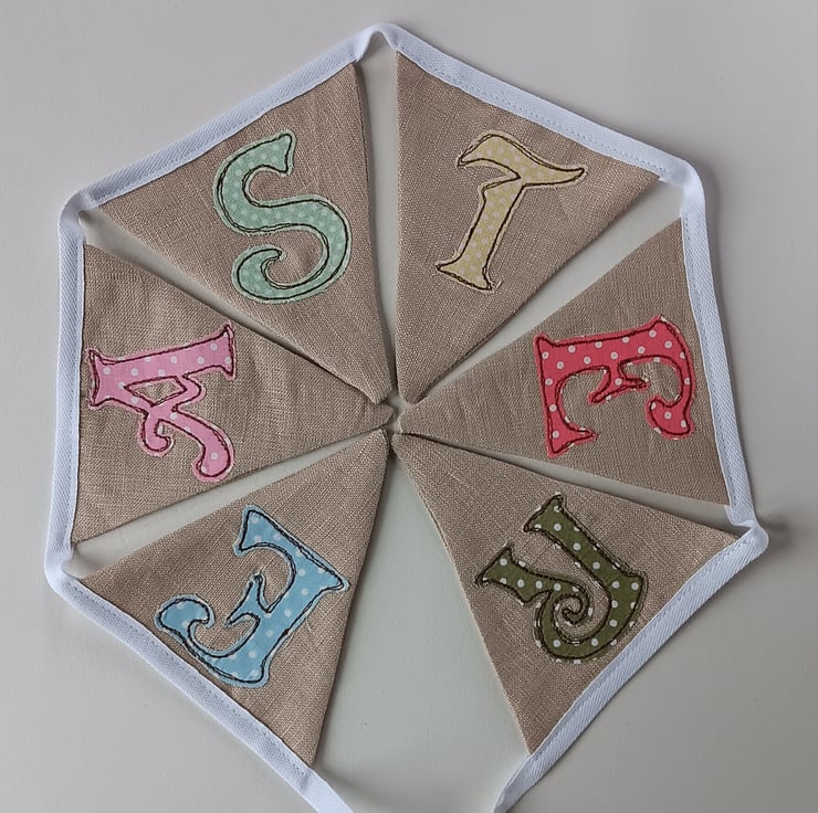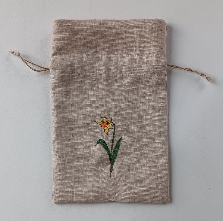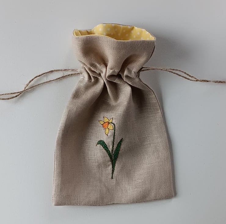 The drawstring bag is made from the same linen and has a daffodil design on it, made using different coloured threads and sewn using free motion embroidery. It has a beautiful spring-like spotty yellow inside cuff and draws closed with jute string. The bag measures approximately 14cm wide and 22cm high. A perfect little bag for keeping the bunting clean and safe when not in use, or using as a gift bag if giving the bunting as a present.