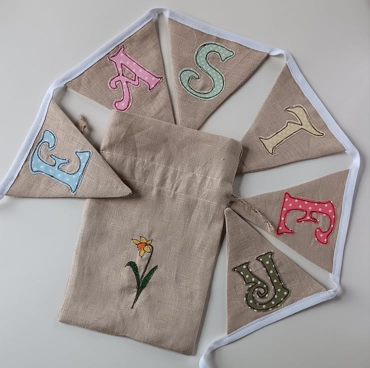 A cute bundle comprising bunting and a drawstring bag. The bunting is made from a lovely beige linen and spells out the word EASTER in different coloured spotty fabrics. It measures approximately 78cm long with an extra 30cm at each end for tying. The flags measure approximately 11cm at widest point and 12cm high