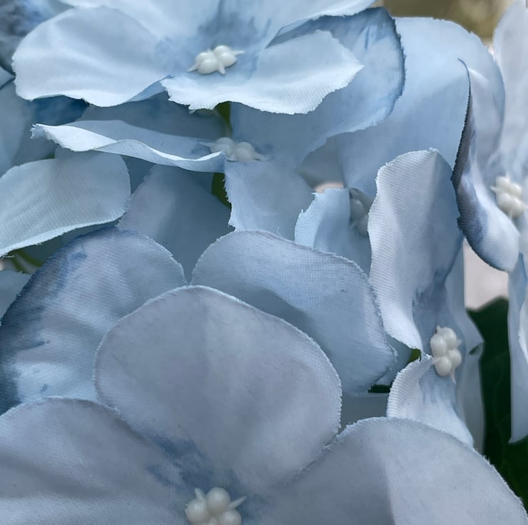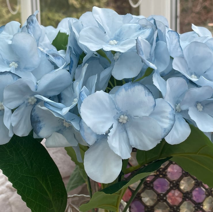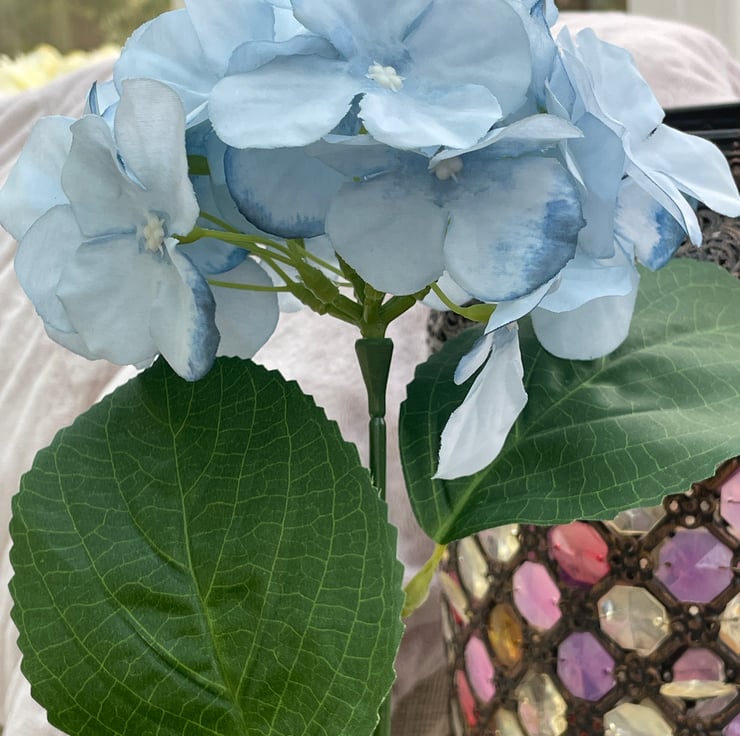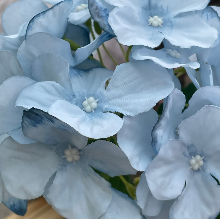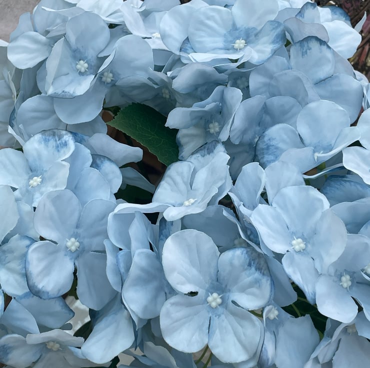 A beautiful and everlasting flower that would grace any home. These 40cm stems are a beautiful pale blue hydrangea. They are crafted from a fabric and each petal is slightly different with different shades of blue. The stems are 30cm long and wired so they can be shaped or shortened as you want, each stem has 2 large leaves. The heads are about 10cm tall and 15cm across (difficult to measure so all measurements are approximate) and consist of 9 stems of 3 flowers giving a full and realistic effect. The flowers can be used in vases or the heads can be used in wreaths, wedding decor, cake decoration, disassembled and used in craft projects, the choice is yours. En mass they look stunning in a vase and make a lovely everlasting display.