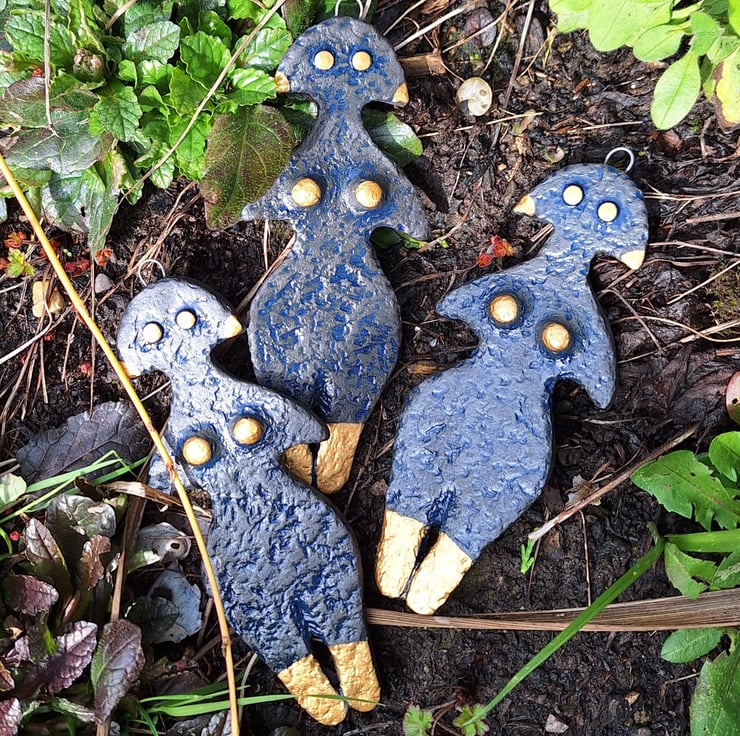 Handmade in black stoneware and finished with a dark blue wash and gold, this beautiful Goddess figure is inspired by ancient early Bronze Age Anatolian figures found. She has a wire hoop for hanging.
