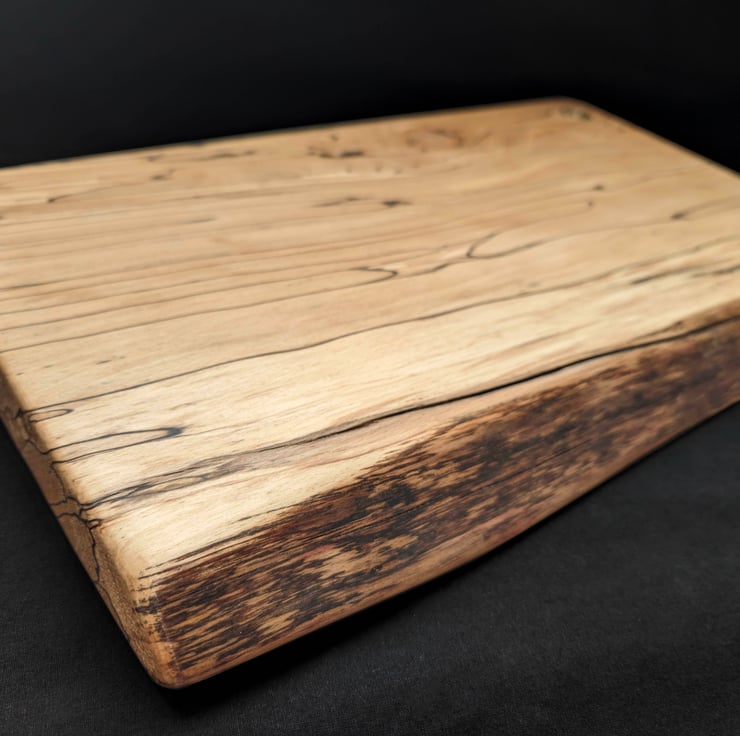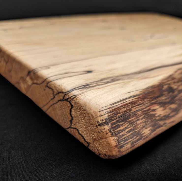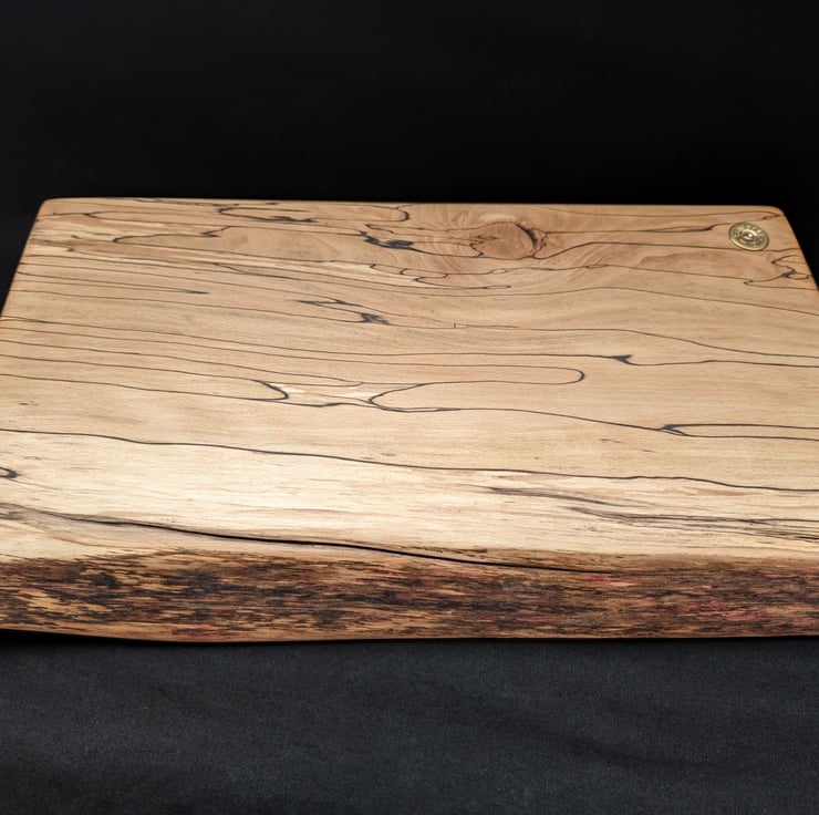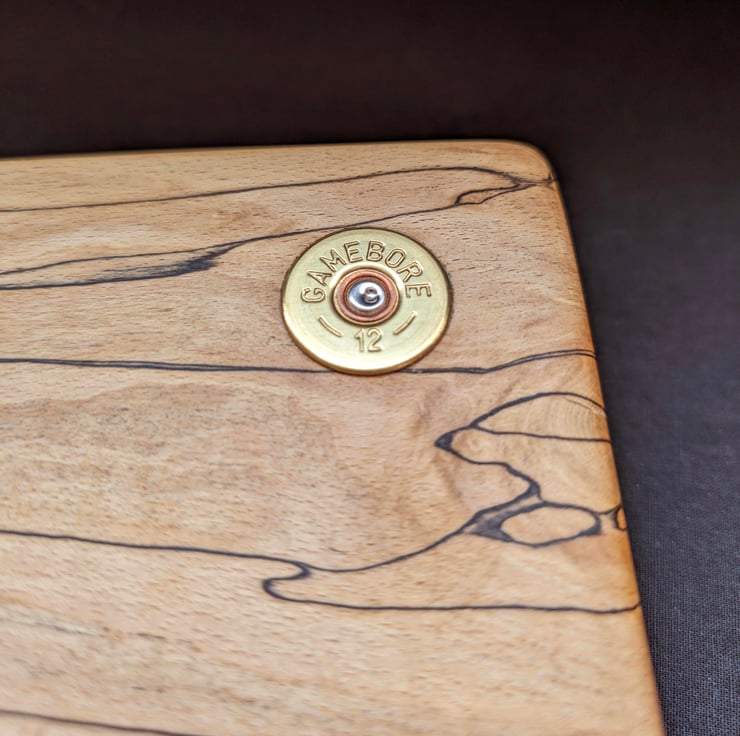 Spalting is a wood colouration that is caused when fungi colonise the wood and extract nutrients from it, leaving behind dark dotted and lined patterns. It also has a shotgun cartridge embedded in the corner as a decorative feature, it's also a little tribute to my Dad.