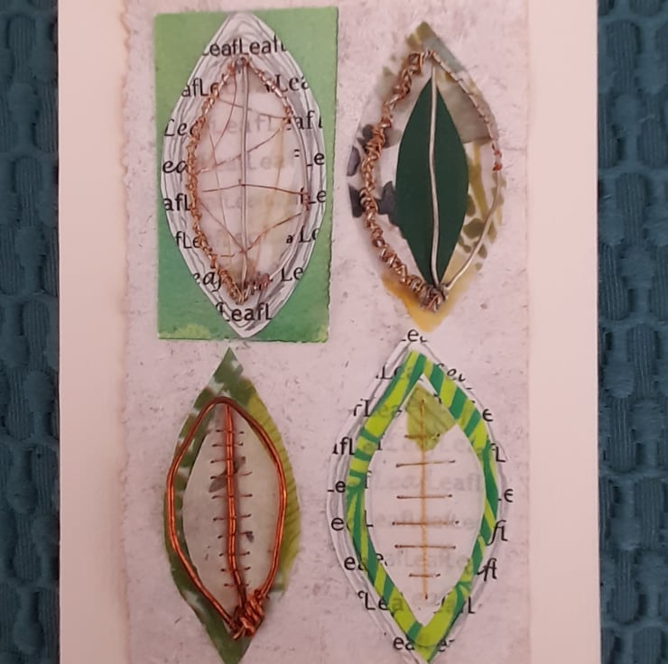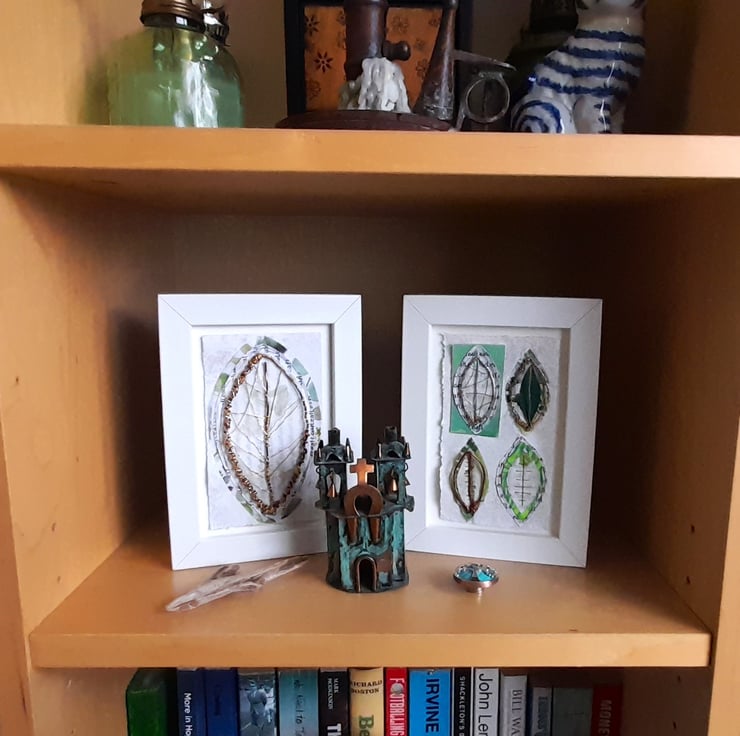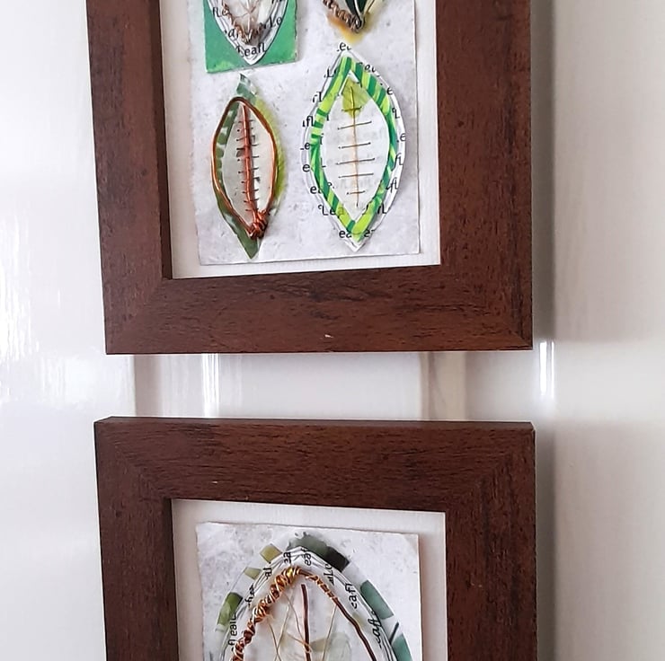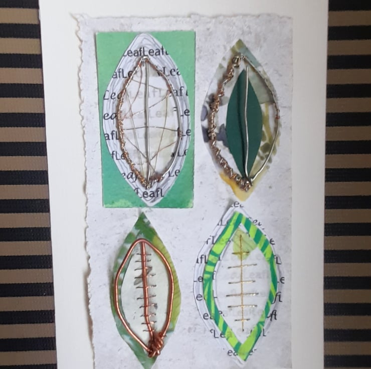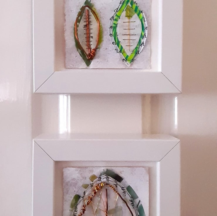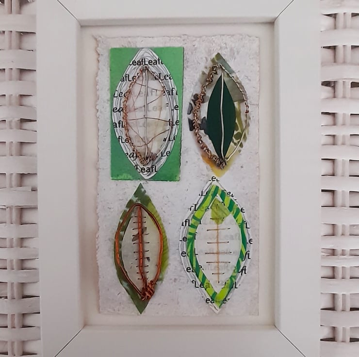My Four Wire Leaves is an original handmade mixed media artwork. The leaves are sculptured from copper, gold & silver wire, some have wire wrapped around for extra decoration & shine. I’ve handstitched on some of the leaves with copper & gold thread. For the wording just behind the wire leaf I’ve typed the word leaf, repeating it by using all the different computer fonts beginning with L, just to add a different visual dimension. I’ve used patterned & textured tissue paper in green tones underneath the wire leaf. This sits on brown wrapping paper textured with white gouache & acrylic paint which is mounted on white water coloured paper. Some of the paper’s edges have been torn to emphasize the paper texture. I’ve kept the background to white & natural green tones but the wire gives a glitzy glamour feel. My artwork will fit perfectly into any home, in more neutral décors but also in more colourful décors. My photographs have been taken to give you an idea of how versatile it can be. It can be hung on the wall or can sit on a shelf. I’ve also made a coordinating ‘Four Wire Leaves’ artwork. Buy as a pair or individually.