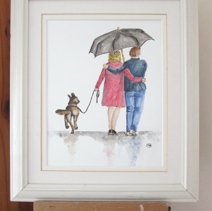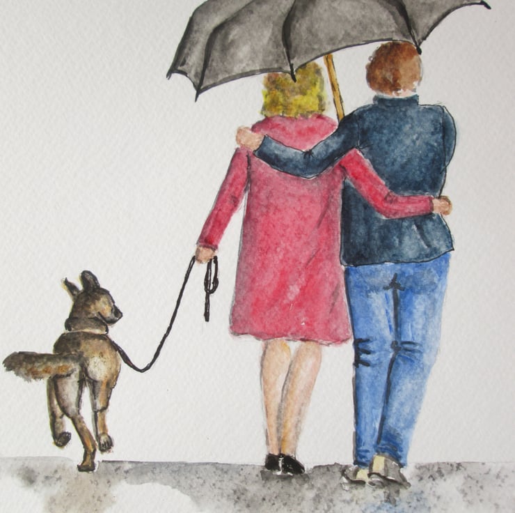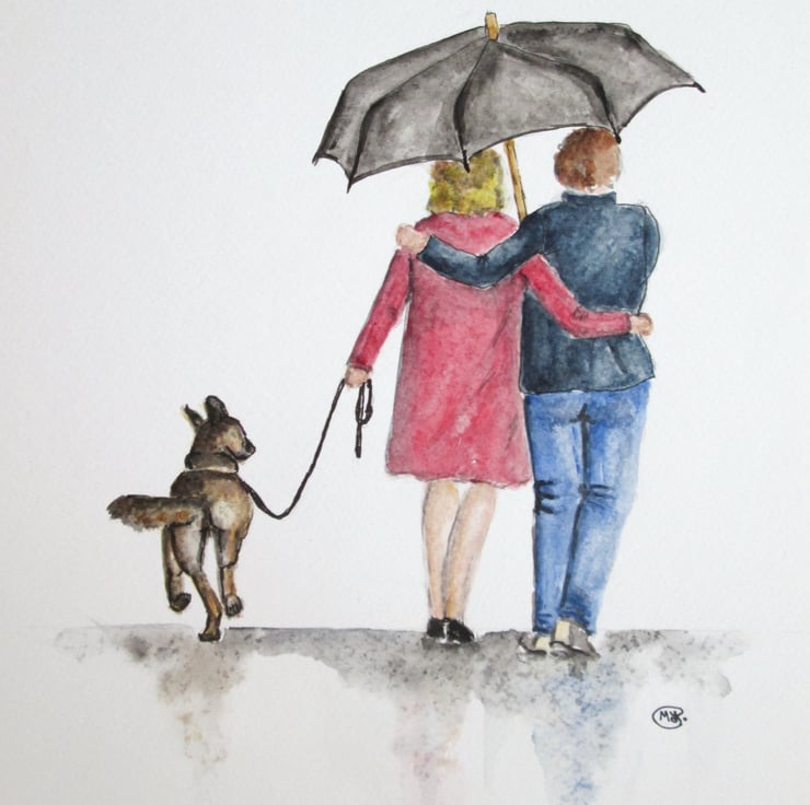 A picture of care and love. Dog lover gift or anniversary gift for couples or parents. A couple walking the dog together.