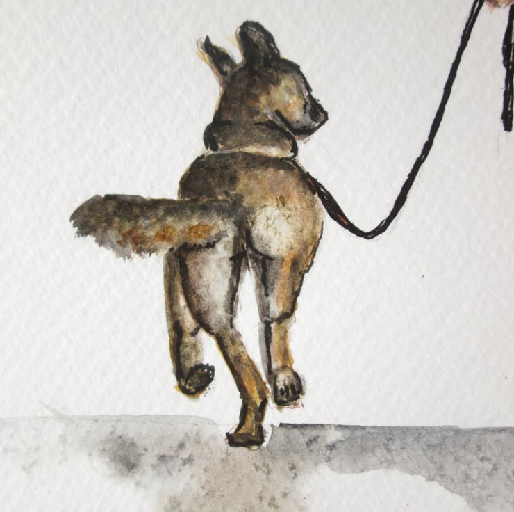 A sensitive painting of a couple walking together with the dog.