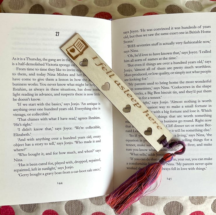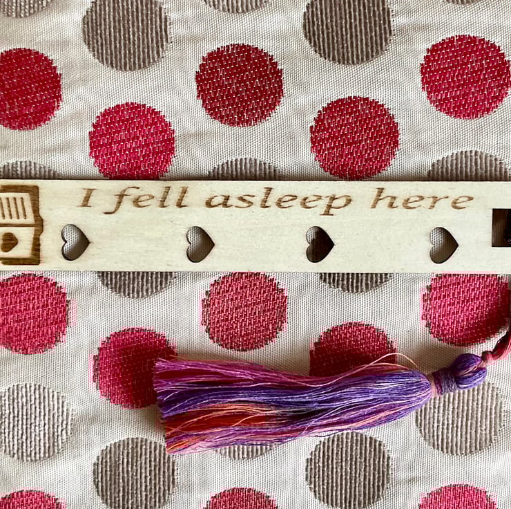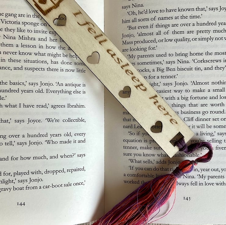This bookmark has been laser cut with four hearts and etched with a book featuring a heart on the cover at the top and finished with the words ‘I fell asleep here’.