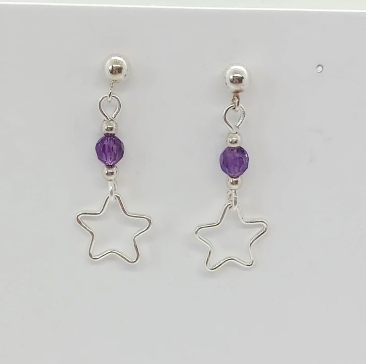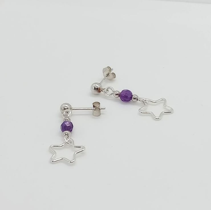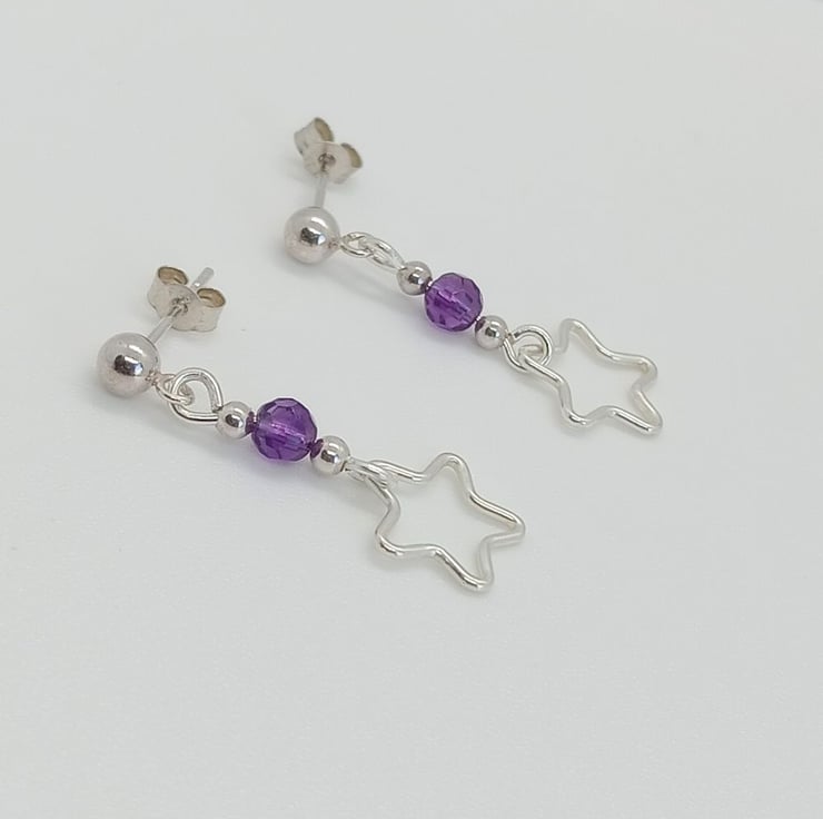 Sterling silver outline stars are suspended from stunning AAA grade 4mm round faceted Amethyst gemstone bead, the Amethyst is nestled between round sterling silver beads looped onto a sterling silver stud ear fitting.