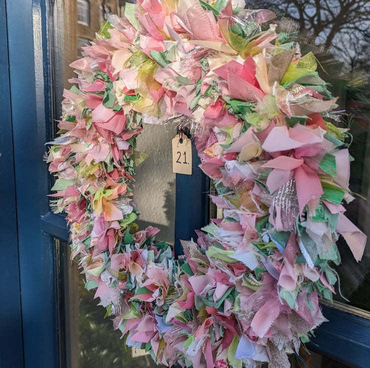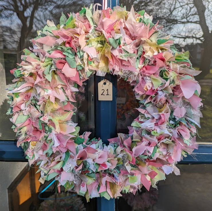 Eco friendly upcycled wreath. Handmade here in the UK in the village of Gainford,with ribbons and materials destined for landfill.