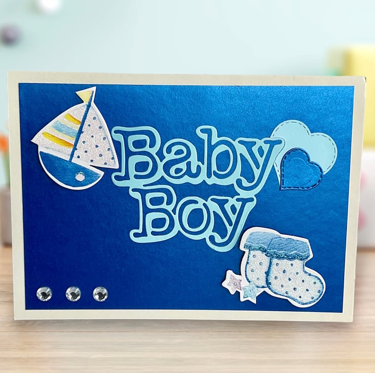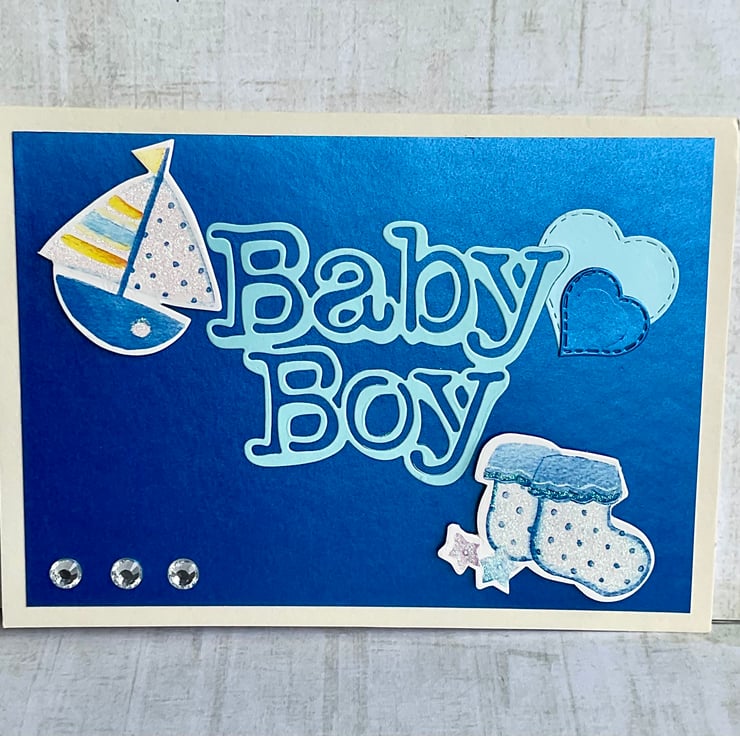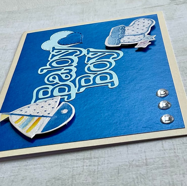 Set on a white base, the card has been layered with metallic blue card with the words Baby Boy and two hearts in pale and metallic blue. The card features a die cut sailing yacht and a pair of booties that are highlighted with glitter. Three gems finish the card.