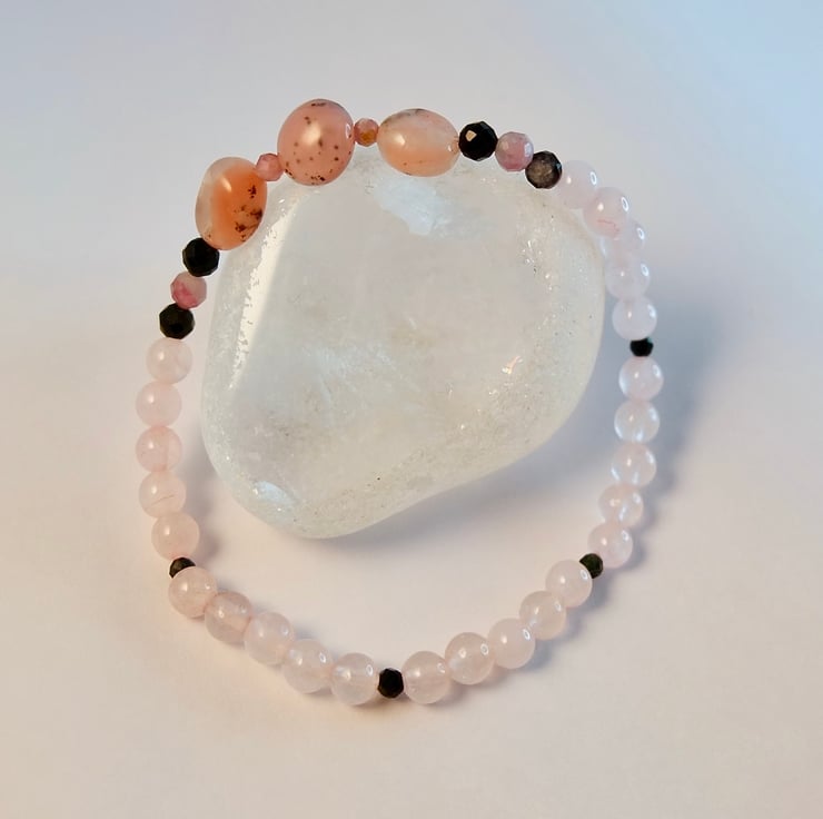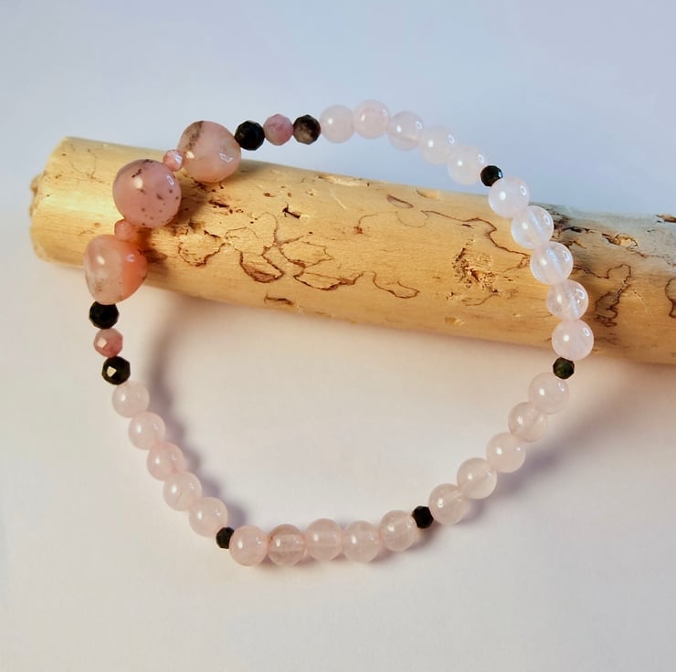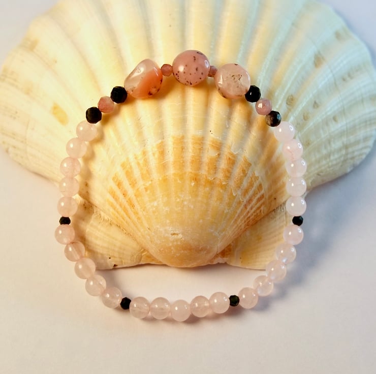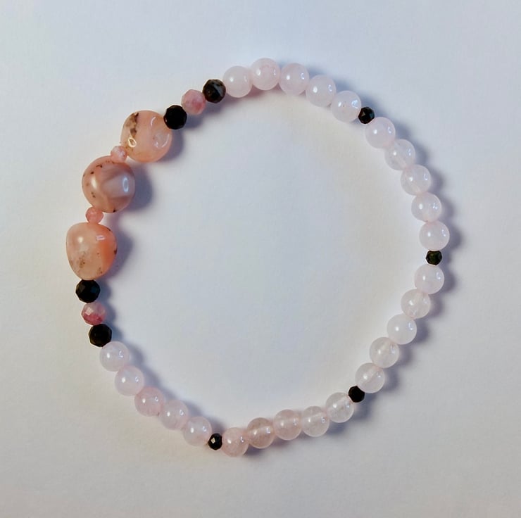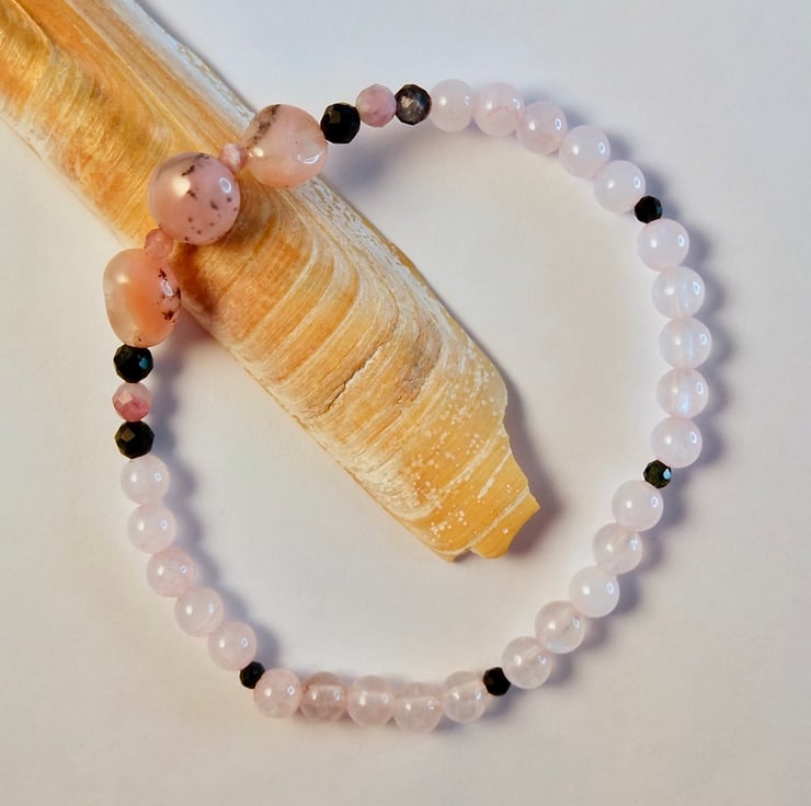 A trio of rough-cut Pink Opal nuggets, separated by 2mm faceted Pink Tourmaline and flanked by 3.5mm faceted Black and Pink Tourmaline form the centrepiece of this dainty bracelet.