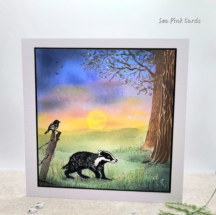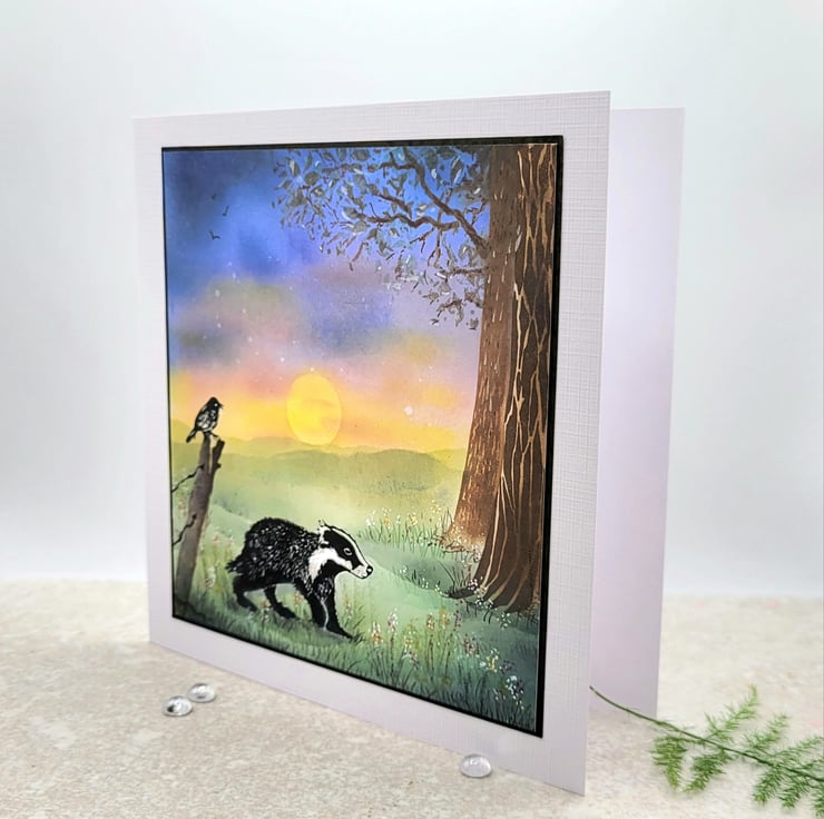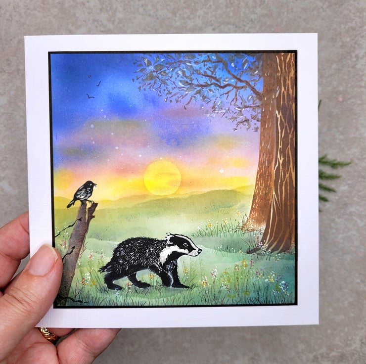 A beautiful handmade blank card for many occasions, with a badger and bird on a fence post. It's twilight and the sun is sinking in the sky. This unique card would be great for father's day, birthdays and lots more, especially for lovers of wildlife and nature. It could be popped into a frame after use, a lovely card to keep.