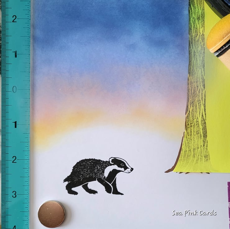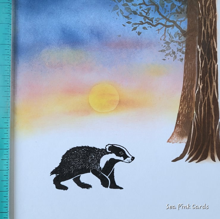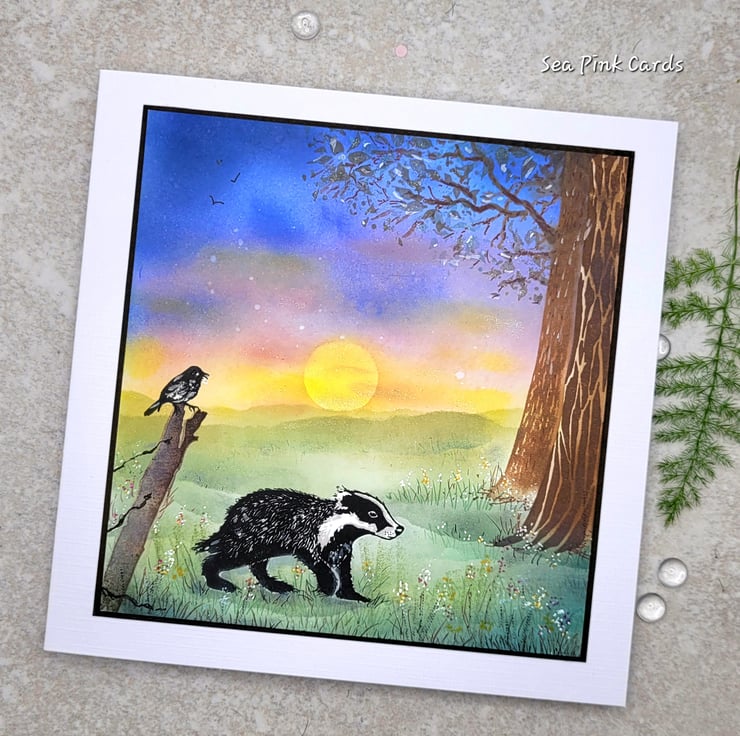 Measuring 14.5 x 14.5 cms the card is made from quality linen textured cardstock and has a top layer of smooth white cardstock featuring the design. I designed and made the card in my craftroom, the badger, bird and trees have been handstamped using stamps by Card-io. I have created the background using various tones of archival, non-toxic inks and blending brushes. Tiny details have been added with fineliner pens.