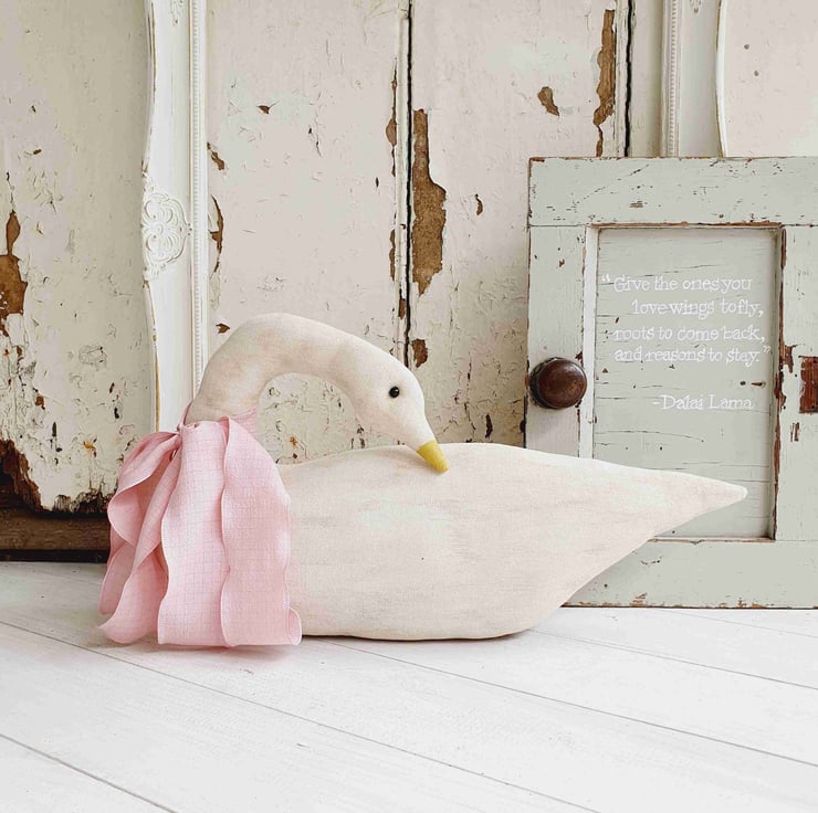 This lovely large primitive style snow goose has been made out of painted fabric. I age my fabric first with walnut granules. They are then painted with acrylic paint and once dried are sanded down. This gives them and aged wooden look. Around her neck has been tied a pink ribbon. She will look great in your home all year round. Due to the handmade nature of this item, no two are exactly the same.
