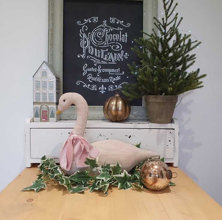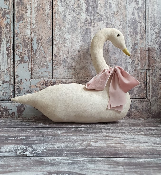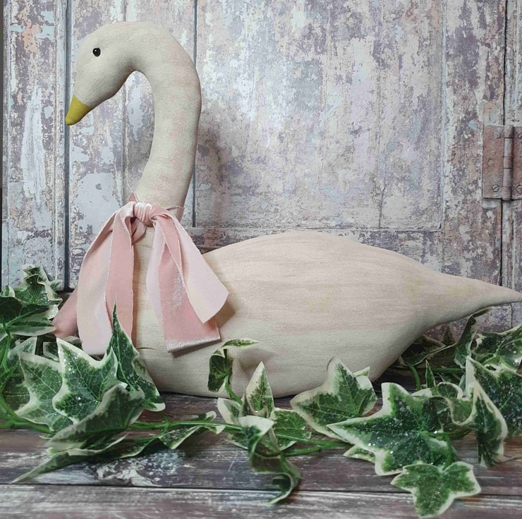 This lovely large primitive style snow goose has been made out of painted fabric. I age my fabric first with coffee, cinnamon and vanilla. They are then painted with acrylic paint and once dried are sanded down. This gives them an aged wooden look. Around her neck has been tied a handmade pink velvet ribbon. She will look great in your home all year round. Due to the handmade nature of this item, no two are exactly the same.