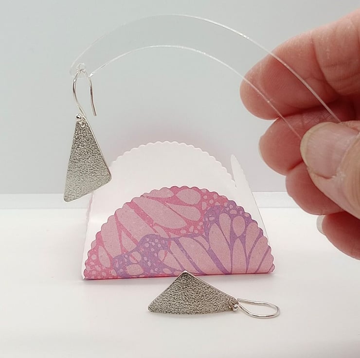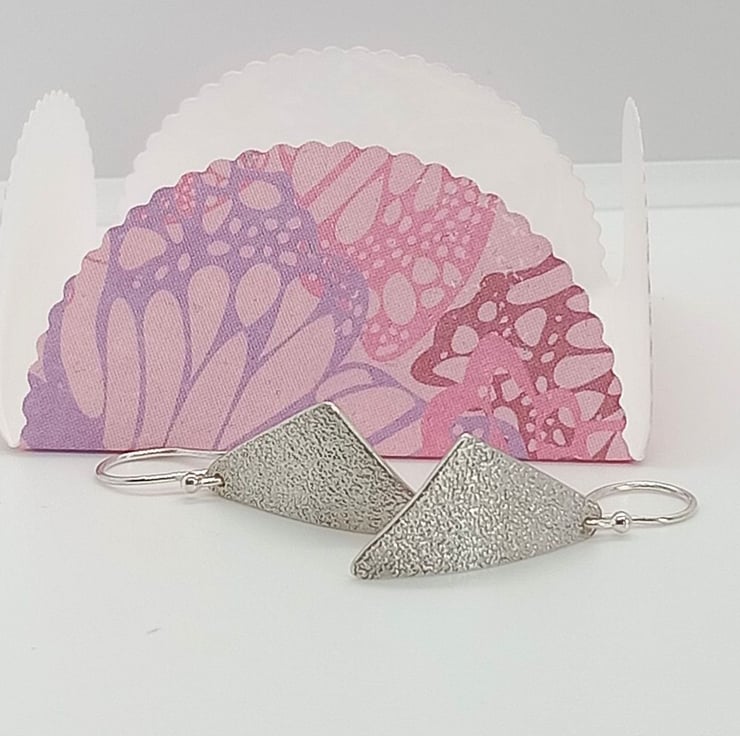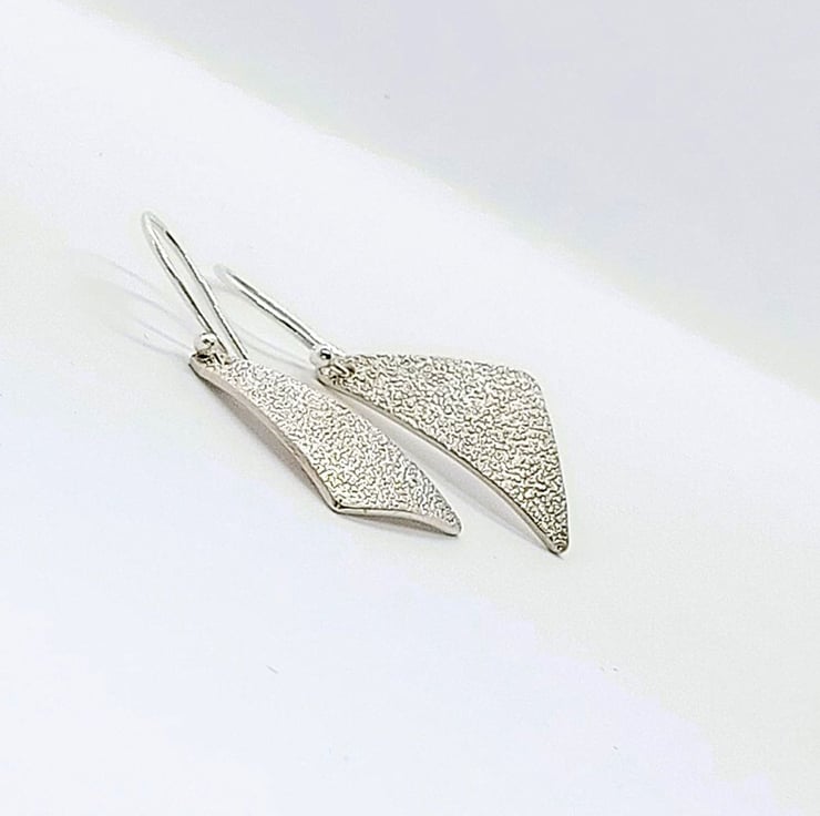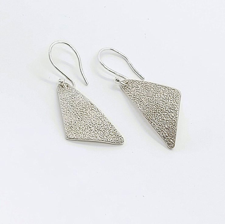 Hand crafted from recycled sterling silver and cut as off set triangles before putting through my rolling mill and adding the texture, the hole for the ear wire drilled and the whole piece cleaned and polished to a high shine before adding the ear wires.