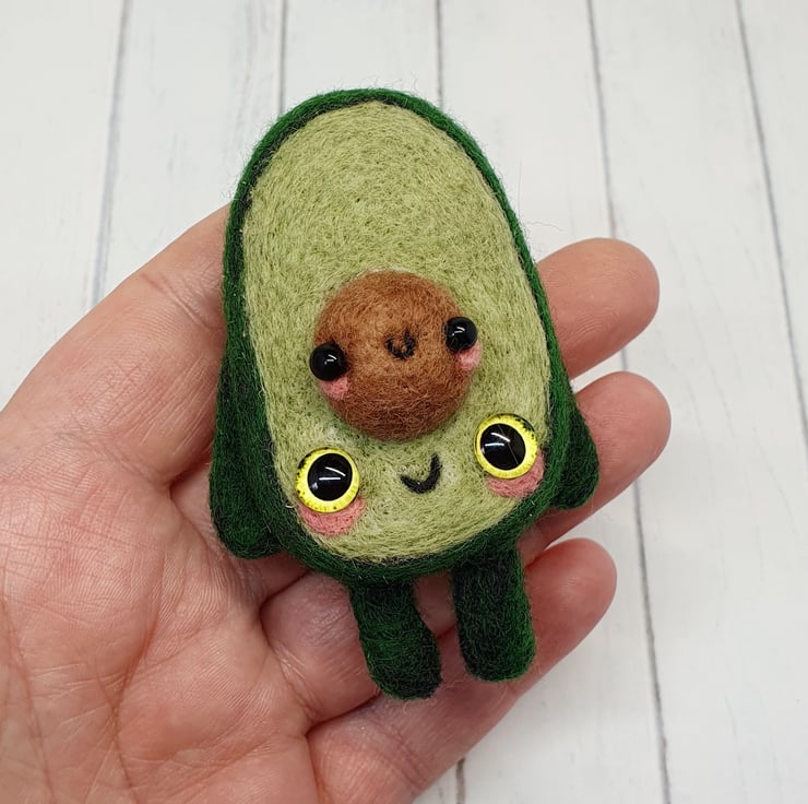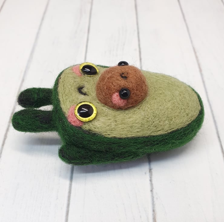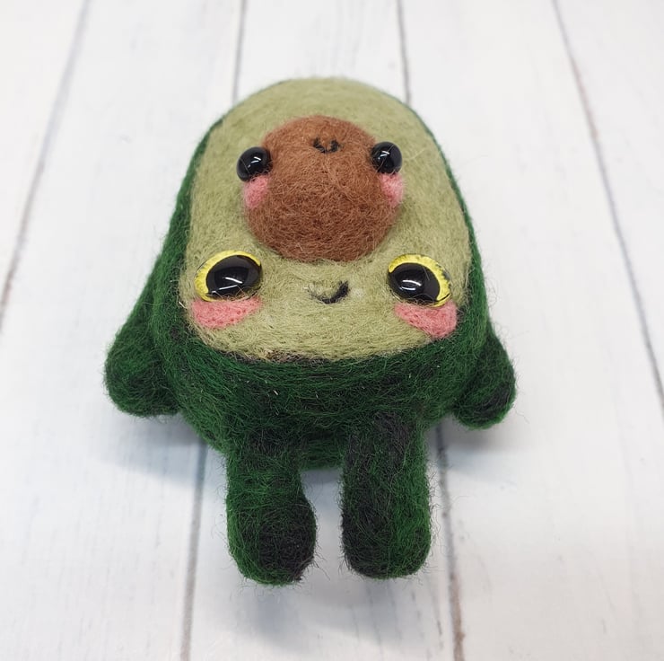 Miniature needle felted fruit doll with glass eyes. This little one of a kind character has pink cheeks and cute seed with cute face. Cannot stand unaided and needs to lean, can come with optional transparent loop hanger. This Avocado measures roughly 8cm tall. This is for decorative purposes only and not a toy.