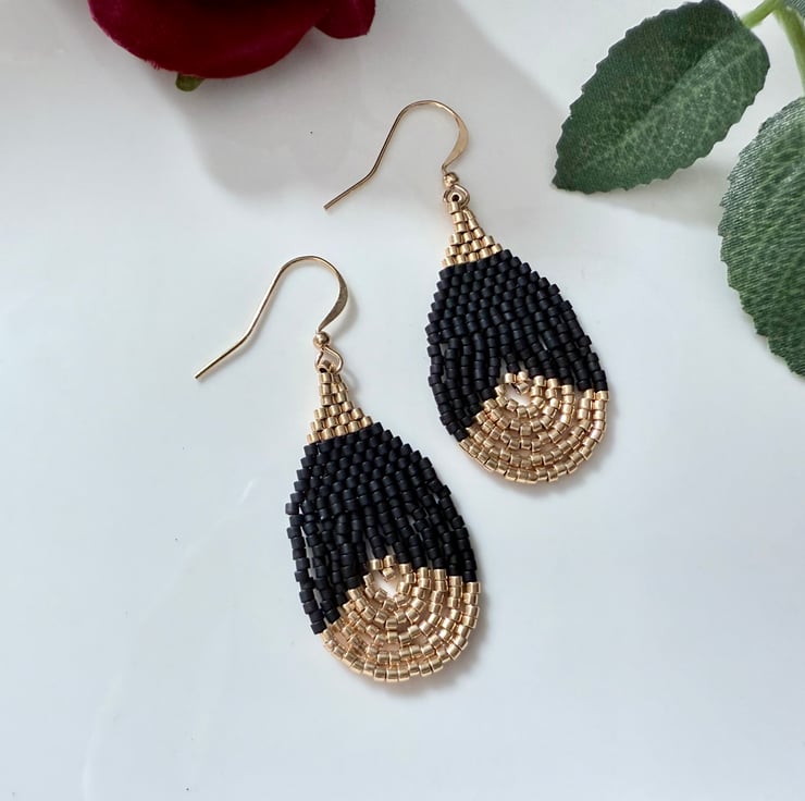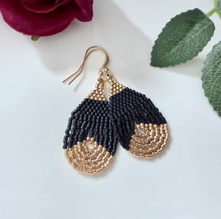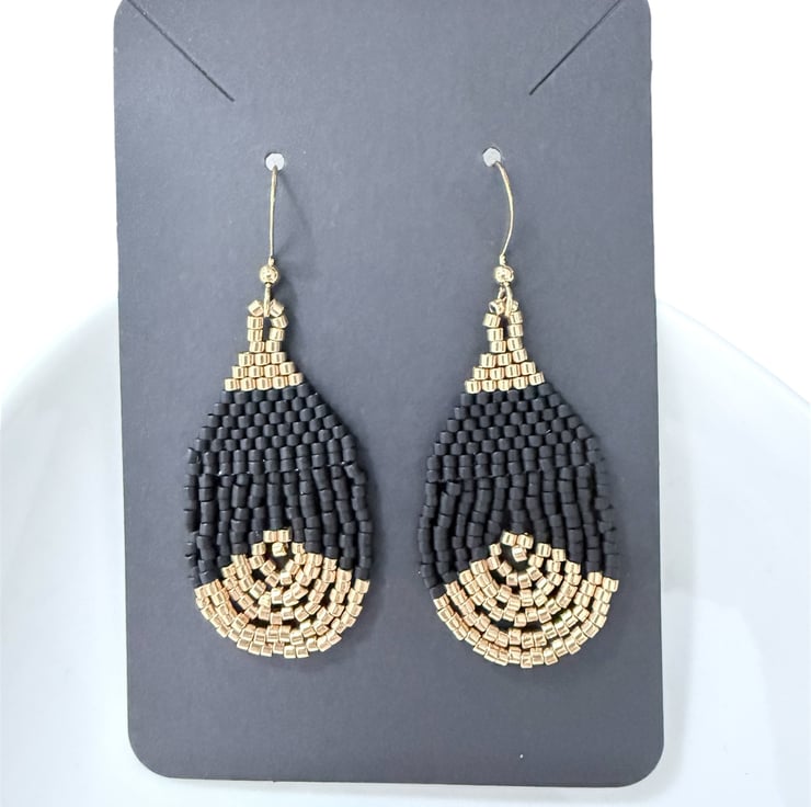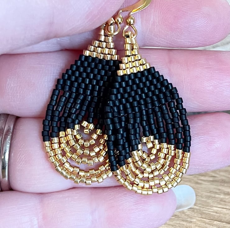 These are lovely lightweight earrings made with tiny glass Miyuki beads hand woven together. The main bead colour of these earrings is in matt black and has been paired with shiny gold coloured beads.