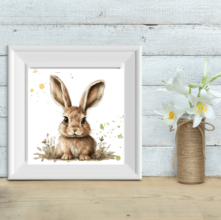 A cute whimsical picture of a baby hare for a child's nursery. The print can be personalised with your child's name and date of birth if you wish. The item is printed on 260gsm watercolour paper and is unframed. Measuring 11" x 11" overall. Framed option available for an additional £15.00, please see separate listing. Please allow up to 5 days for this item. Also available in this range is a greeting card, storybook and a colouring book.