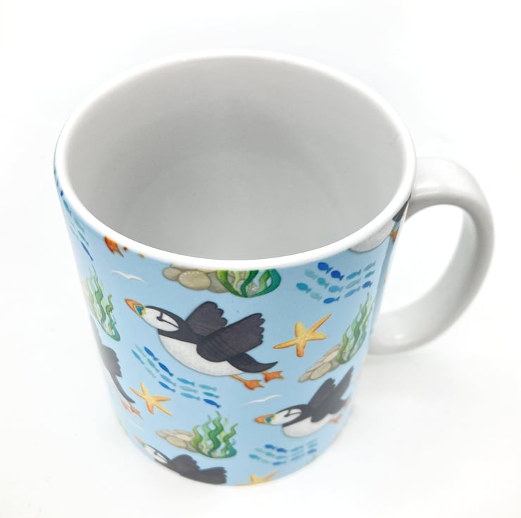 These cheerful, seaside ceramic mugs will add a splash of sunshine to your coffee table! This mug has a wrap-around image of my cute puffins and is dishwasher-friendly and printed in vivid, long-lasting colours!